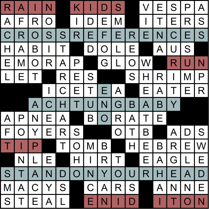 The final puzzle provided another path to the answer. The central entry was the seminal U2 album ACHTUNG BABY, intersected by one of the album’s producers, Brian ENO. The final “way to corroborate the mega-meta answer” was to STAND ON YOUR HEAD, turning ENO upside down to get (what else?) ONE by U2, which is the answer to the mega-meta.