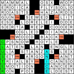 Kudos to ab, Brent Holman, Cenarius, JanglerNPL, Jasters, j, jeremiahsjohnson, Vraal, and Steve Williams for solving the mega-meta without the help of this puzzle. A key to figuring out the mega-meta early was noticing the unusual clues involving numbers. A few of the early solvers told me they were tipped off by the strangeness of [“Warning ___” (Coldplay song from the movie “Code 46“)] which clued SIGN in the September puzzle. Another small tip-off was that the partial song titles were always clued non-musically – e.g. LOVE was clued as [Word in an iconic Robert Indiana sculpture] instead of using the many possible musical references.