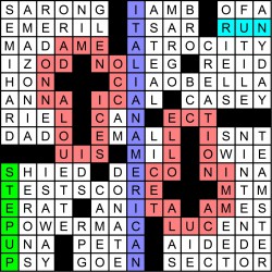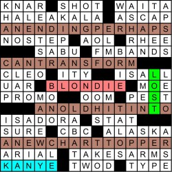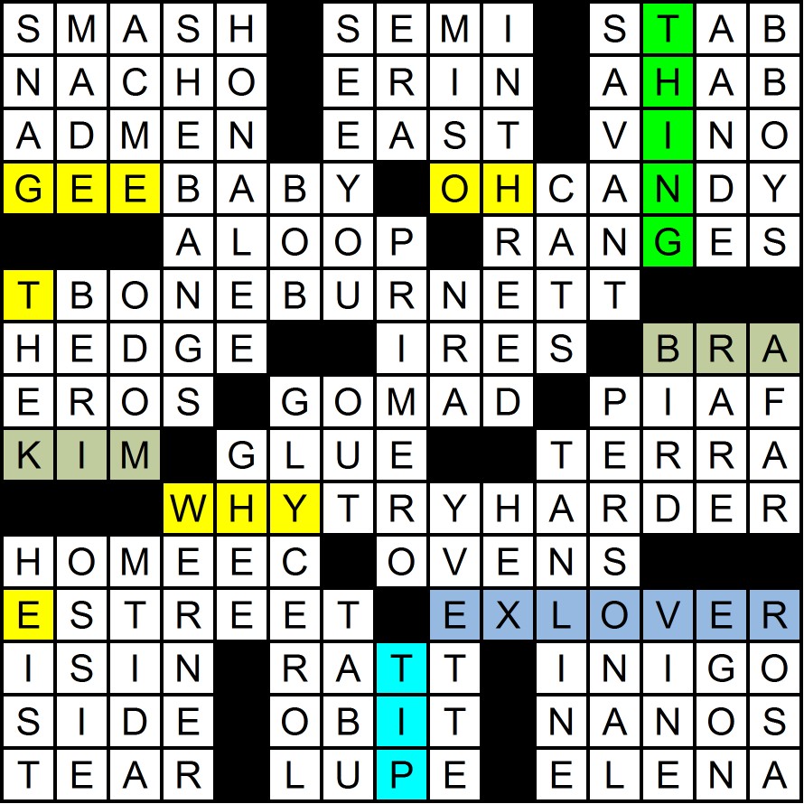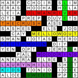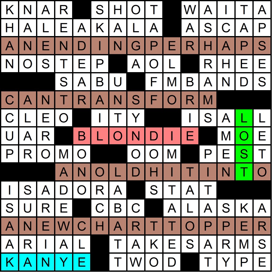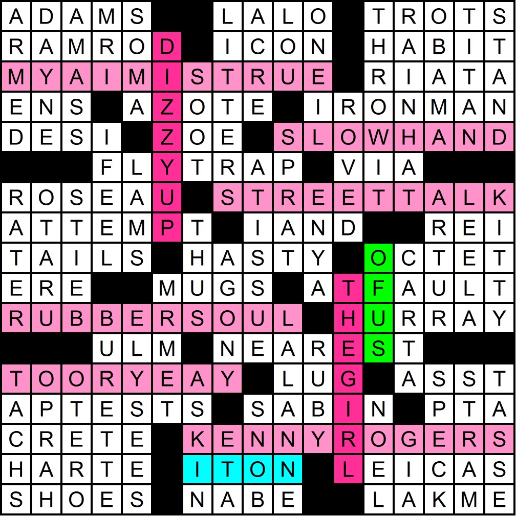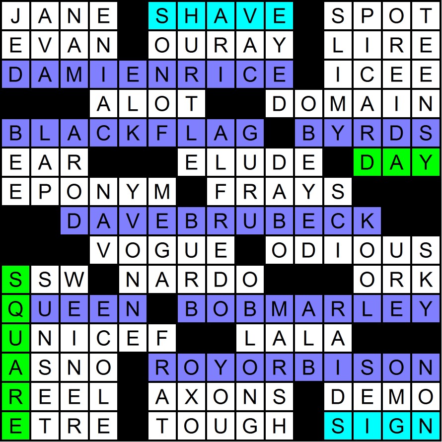 Similarly, the other four clues referenced Elvis Presley‘s “One Night,” Finger Eleven‘s “One Thing,” Barenaked Ladies “One Week,” and Joan Osborne‘s “One of Us.” Likewise, the puzzles for the other five months not referenced in the final puzzle contain similar patterns of key clues leading to specified grid entries. The gallery below shows all 11 puzzles (click to enlarge), with Aqua highlighting the clued word and Lime the partial song title. The table below the gallery (click to open) shows all 12 songs with “One” in the title (one for each puzzle except September, which had two), in addition to the clues for the cross-referencing entries.