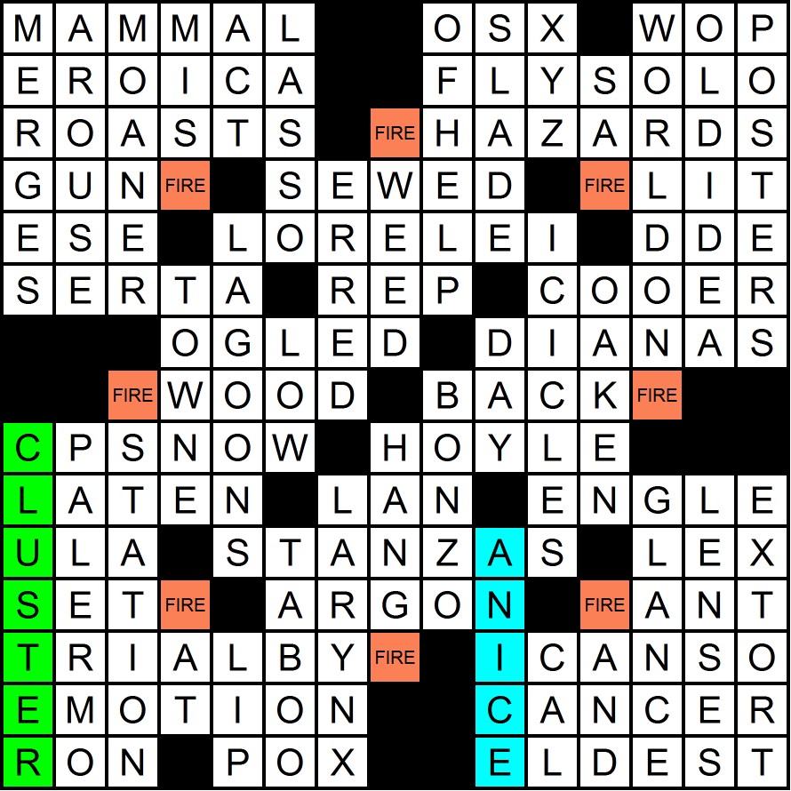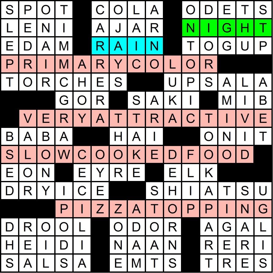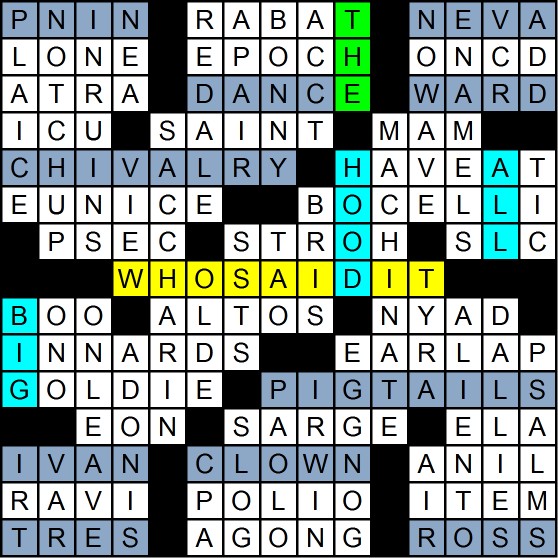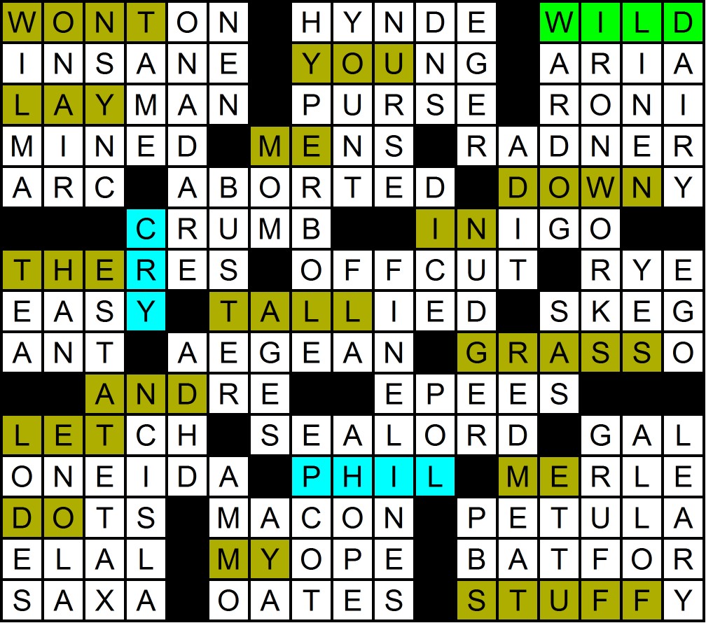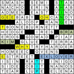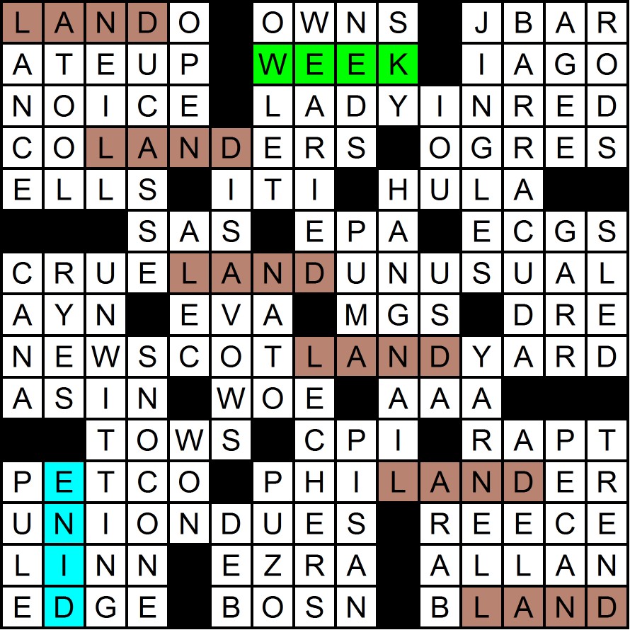 Similarly, the other four clues referenced Elvis Presley‘s “One Night,” Finger Eleven‘s “One Thing,” Barenaked Ladies “One Week,” and Joan Osborne‘s “One of Us.” Likewise, the puzzles for the other five months not referenced in the final puzzle contain similar patterns of key clues leading to specified grid entries. The gallery below shows all 11 puzzles (click to enlarge), with Aqua highlighting the clued word and Lime the partial song title. The table below the gallery (click to open) shows all 12 songs with “One” in the title (one for each puzzle except September, which had two), in addition to the clues for the cross-referencing entries.