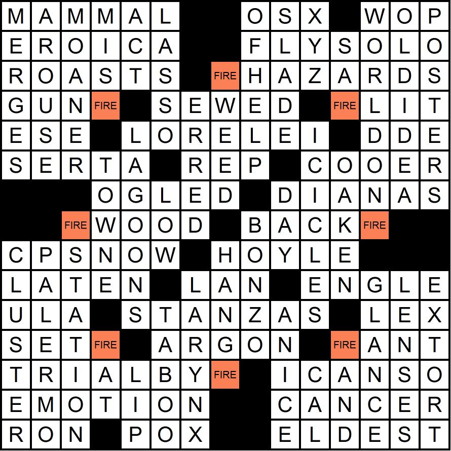 There were 18 submissions of other fire songs, “Fire” by Jimi Hendrix or Arthur Brown, “Play With Fire” by the Stones, “Light My Fire” by the Doors, and “Great Balls of Fire” by Jerry Lee Lewis. While most of these songs were ’60s hits, none really describes what can be found in the grid or takes into account the title, and hence I’m not giving credit for any of these answers. Janet T backs me up: