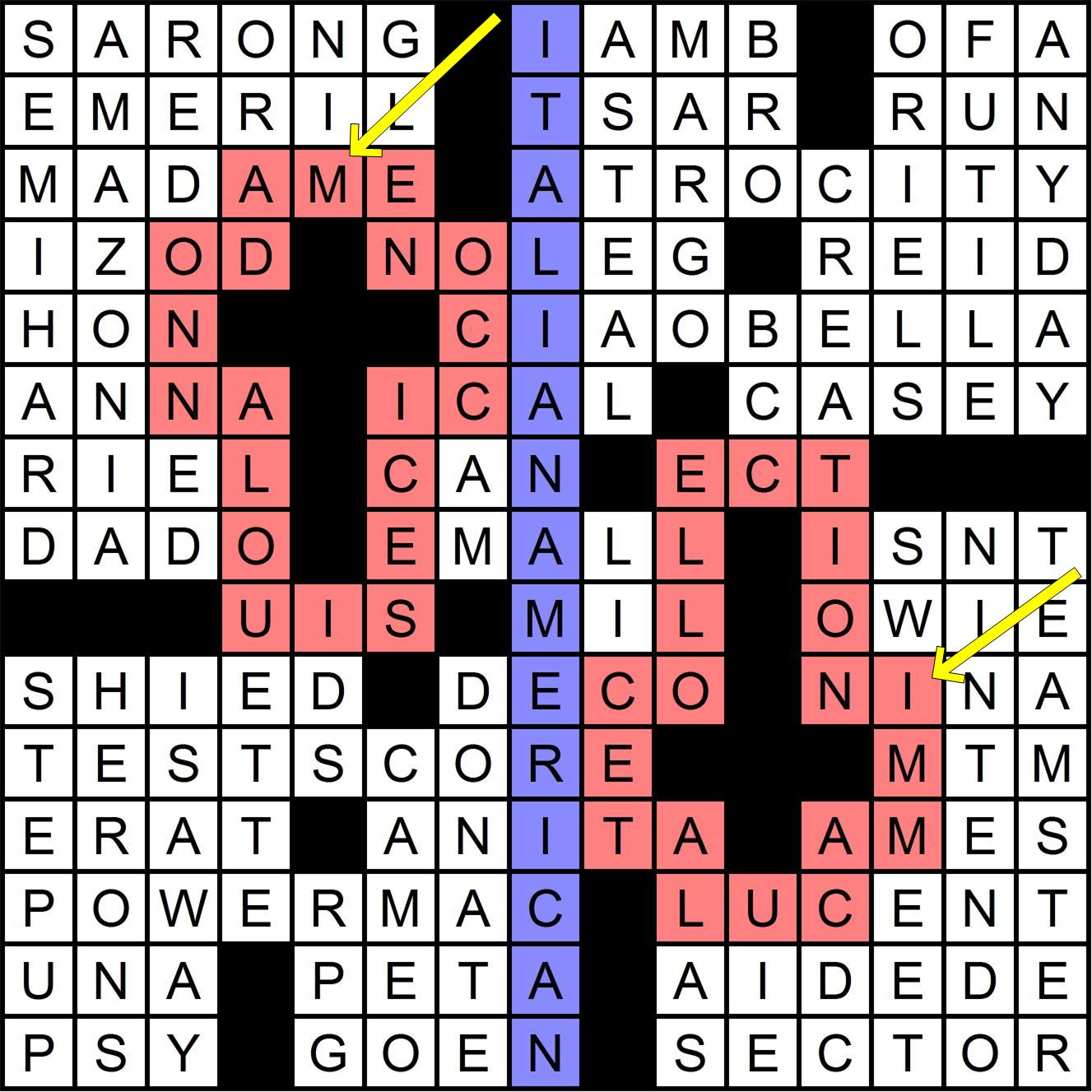 Others had to work a little harder to find MADONNA LOUISE CICCONE written around the cross in the northwest corner, and the meta answer, (The) IMMACULATE COLLECTION, around the cross in the southeast. The long vertical entry, ITALIAN AMERICAN, also hinted at Madonna.