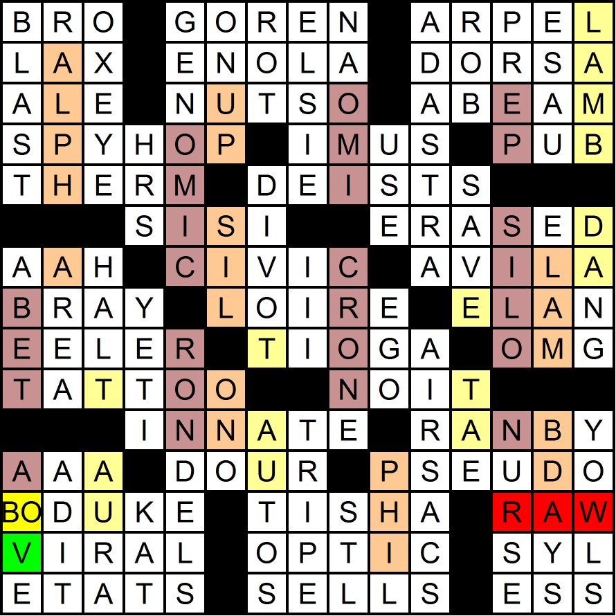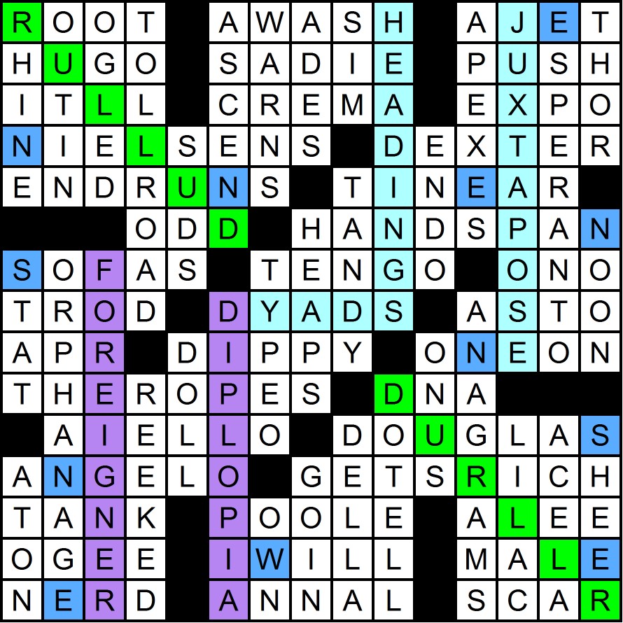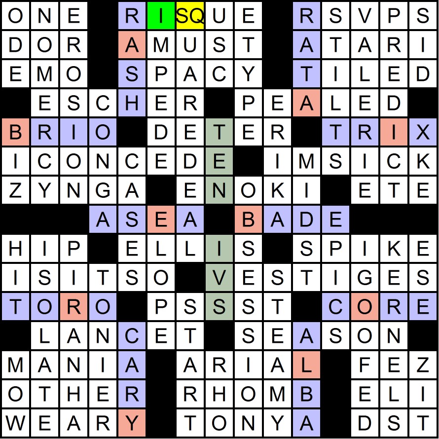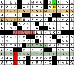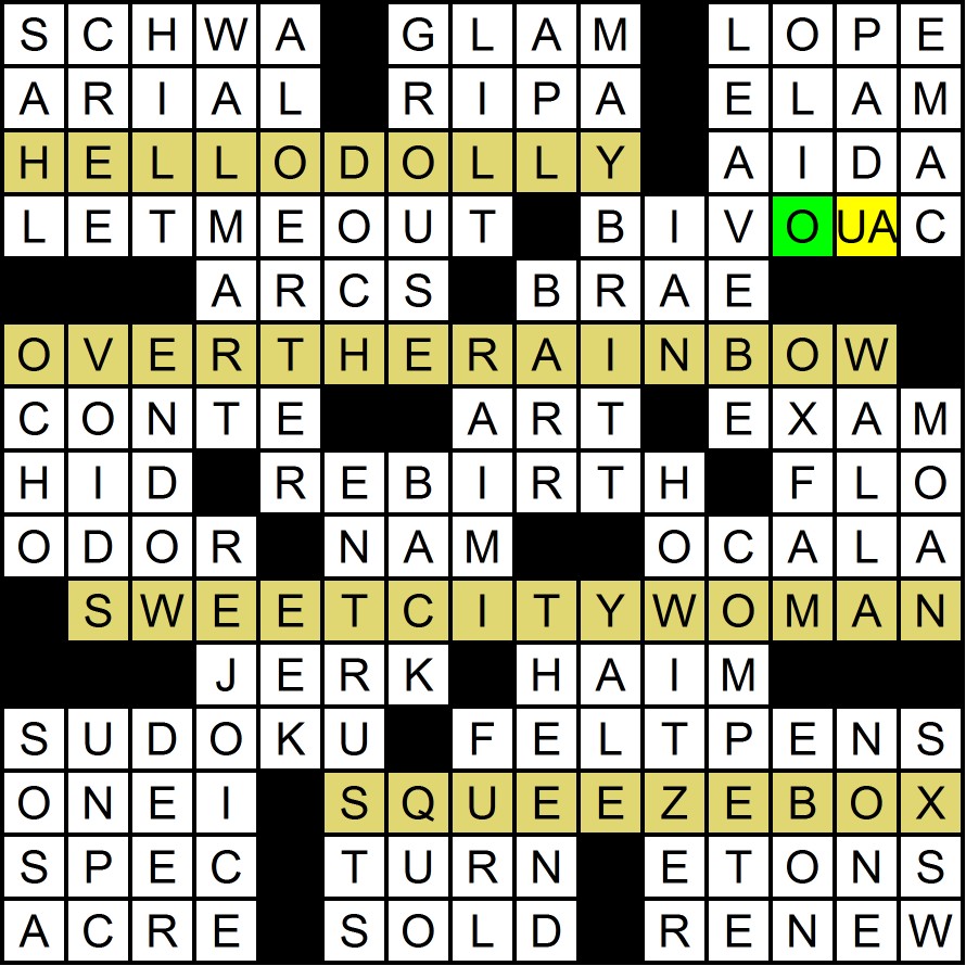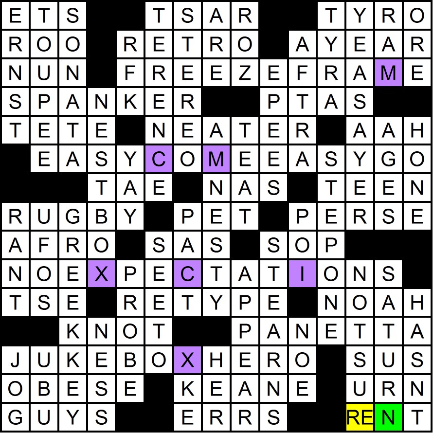 The final MMMM of the year brings the mega-meta reveal. Each of this year’s 12 MMMM puzzles contains a rebus square with two-letter DYADS. If you JUXTAPOSE them, you get the phrase SE-LE-CT-AN-EI-GH-BO-RI-NG-SQ-UA-RE, or SELECT A NEIGHBORING SQUARE. For those solvers who had not yet figured out which squares to select, this puzzle gives the HEADINGS necessary to determine which 12 squares to choose. Using R for Right, L for Left, U for Up, and D for Down, and working your way through the R, U, L, L, U, D, D, U, R, L, L, and R squares adjacent to the rebus squares (one letter per month), you get DOUBLE VISION, the FOREIGNER hit, and this year’s mega-meta answer. As a number of observant solvers noticed, DIPLOPIA, the entry symmetric to HEADINGS, is the medical term for DOUBLE VISION.