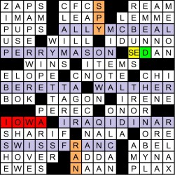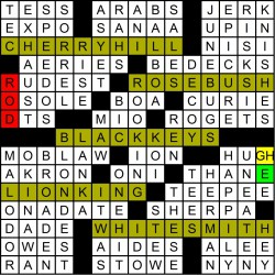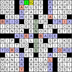 A total of 115 solvers got the mega-meta correct this year, and 85 got the COLD AS ICE bonus answer. This month’s randomly chosen winner of an MMMM mug is Paolo P from San Diego. The average user rating for the puzzle was 4.37 stars out of 5, with an average difficulty level of 2.8. Thanks as always to Matt Gaffney for blogging the puzzle at Crossword Fiend, where you can rate the puzzle or leave a comment. I really appreciate people taking the time and rating the puzzle – thanks!