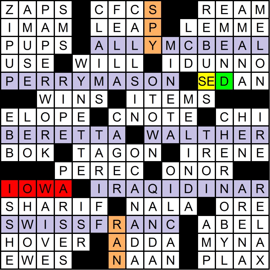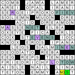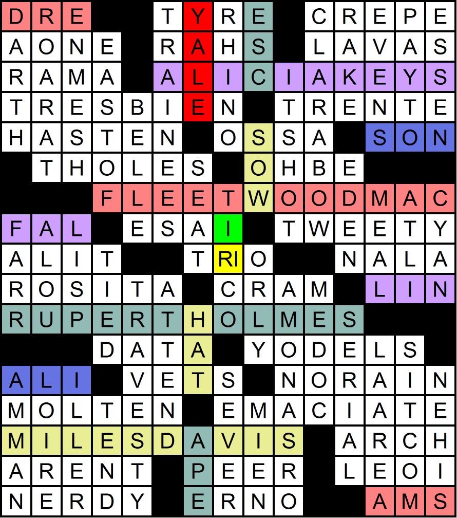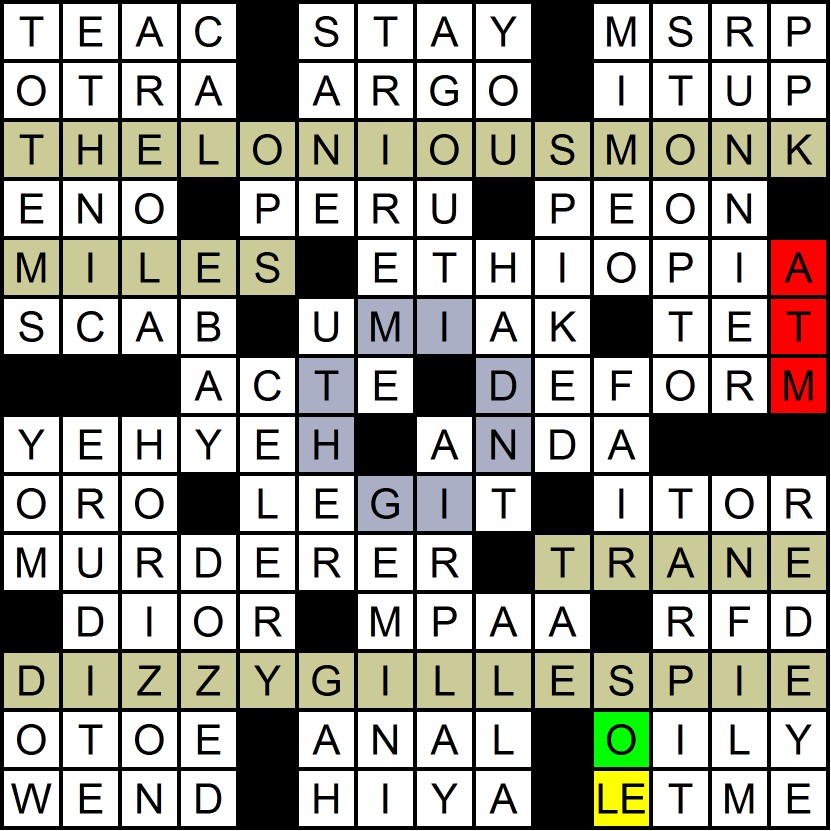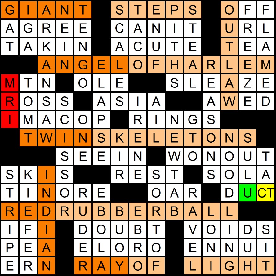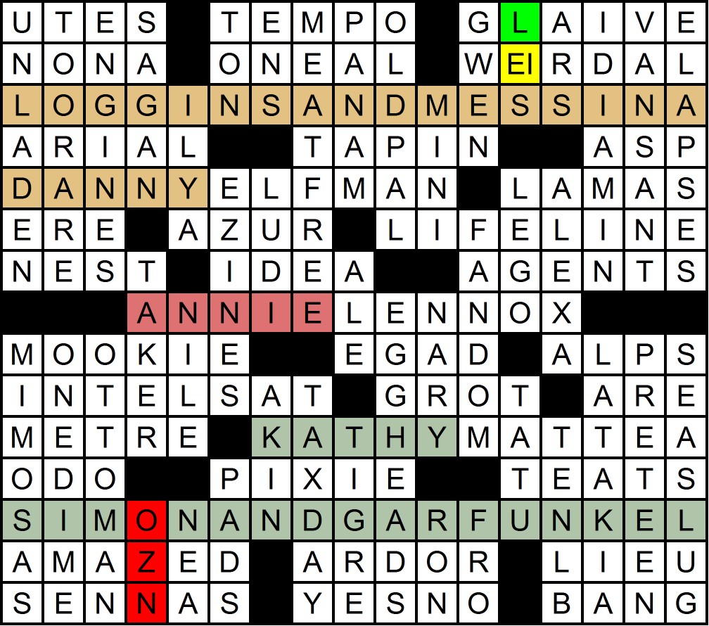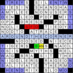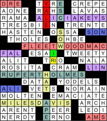 Because of the large number of solvers who got the mega-meta before this final puzzle, I decided to add a little bonus. Twelve blue squares in the grid give an alternate set of direction headings, and point to 12 letters that can be anagrammed into another Foreigner song, and the first name of one of its band members. Using N for North, S for South, E for East, and W for West, the headings E, N, N, E, N, S, N, S, N, W, E, and E point to this set of letters: D,O,A,S,L,E,A,C,I,I,C,N. With a little work, they anagram to COLD AS ICE and IAN (McDonald). Believe it or not, I didn’t come up with this bonus question until after all 12 puzzles were done, so it was pretty lucky to find a nine-letter song by Foreigner in there along with IAN. Frank Longo also found that you can make SOUND STUDIOS by anagramming 12 appropriately selected adjacent squares.