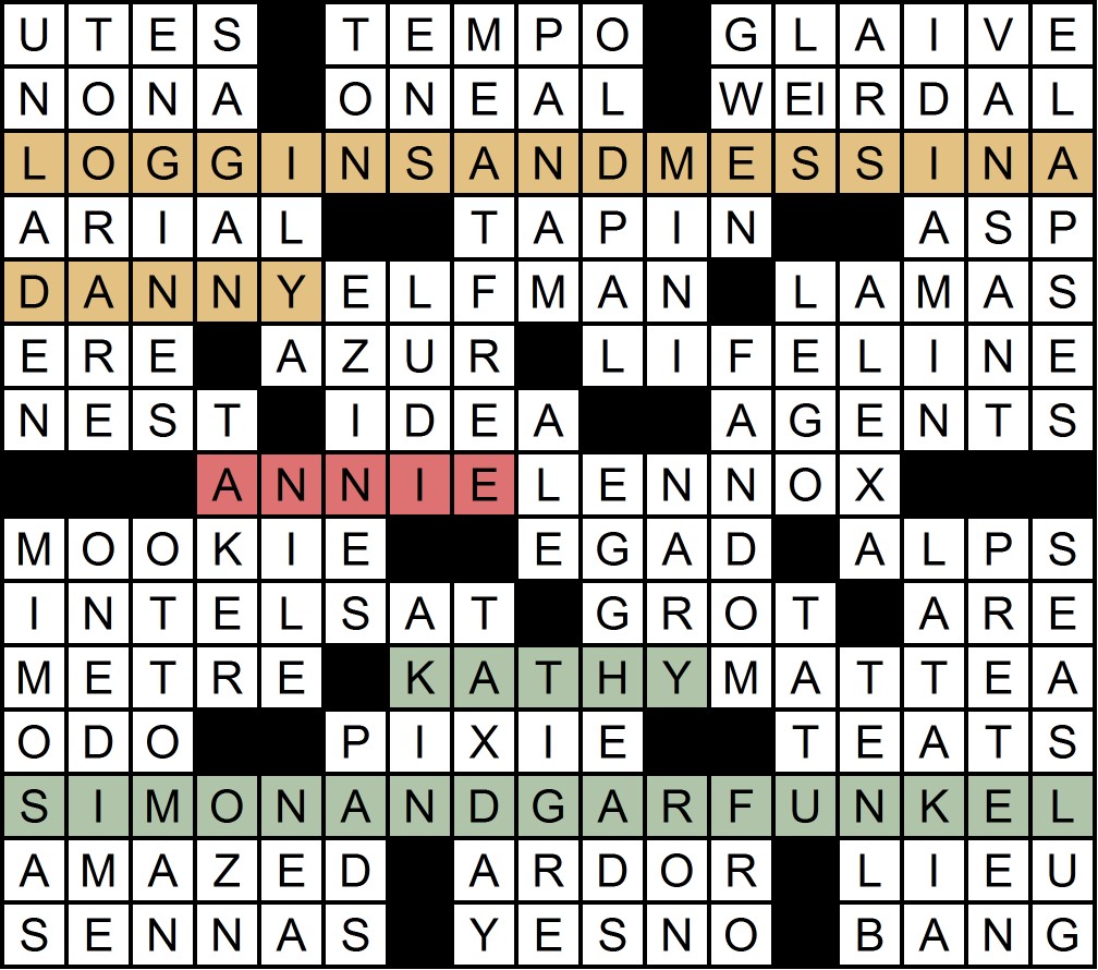 A total of 148 solvers figured out this month’s meta answer, the singer-songwriter who would make an appropriate sixth theme entry. How did they get there? “FROM” was appended to the clues for two theme entries: LOGGINS AND MESSINA and SIMON AND GARFUNKEL.”TO?” was appended to the clues for the other three: DANNY ELFMAN, ANNIE LENNOX, and KATHY MATTEA. The title “Now That’s Dedication!” pointed the way to “DANNY’s Song” (Loggins and Messina), KATHY’s Song (Simon and Garfunkel), and finally “ANNIE’s Song,” a classic from the ’70s by John Denver, the meta answer.