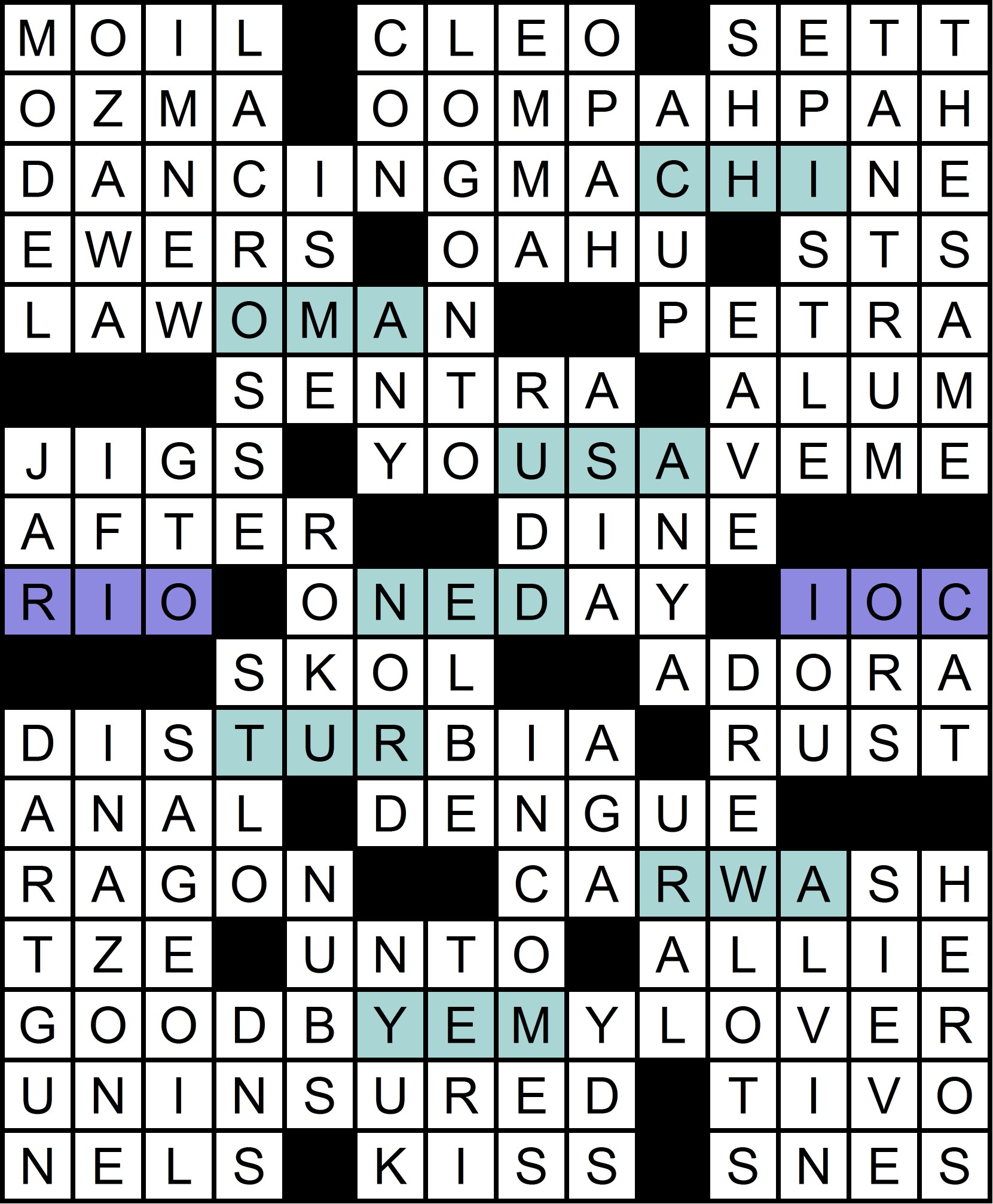 August’s MMMM challenged solvers to find a music genre. Two of the symmetric center entries (RIO/IOC) as well as the puzzle’s title (“Let the Games Begin”) suggest that the meta is somehow related to the Olympic Games. The clue for IOC, [Org. that assigns many three-letter codes], hints at the path to the solution. Each of the seven theme entries contains exactly one three-letter Olympic country code, as follows: