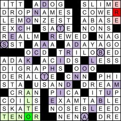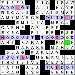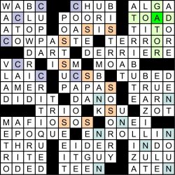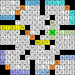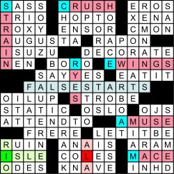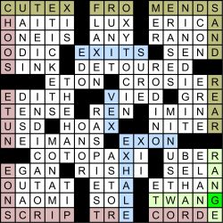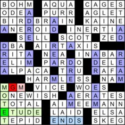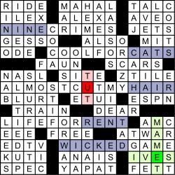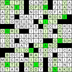 A total of 183 solvers found their way to the correct answer this month. The average rating for the puzzle was 4.47 stars (highest of the year “ thank you!), and the average difficulty rating was 2.89. This month™s randomly chosen winner of an MMMM coffee mug is Kevin Newman from Dallas. Thanks to Matt Gaffney for blogging the puzzle at Crossword Fiend, where you can rate the puzzle (thanks!) and/or leave a comment.