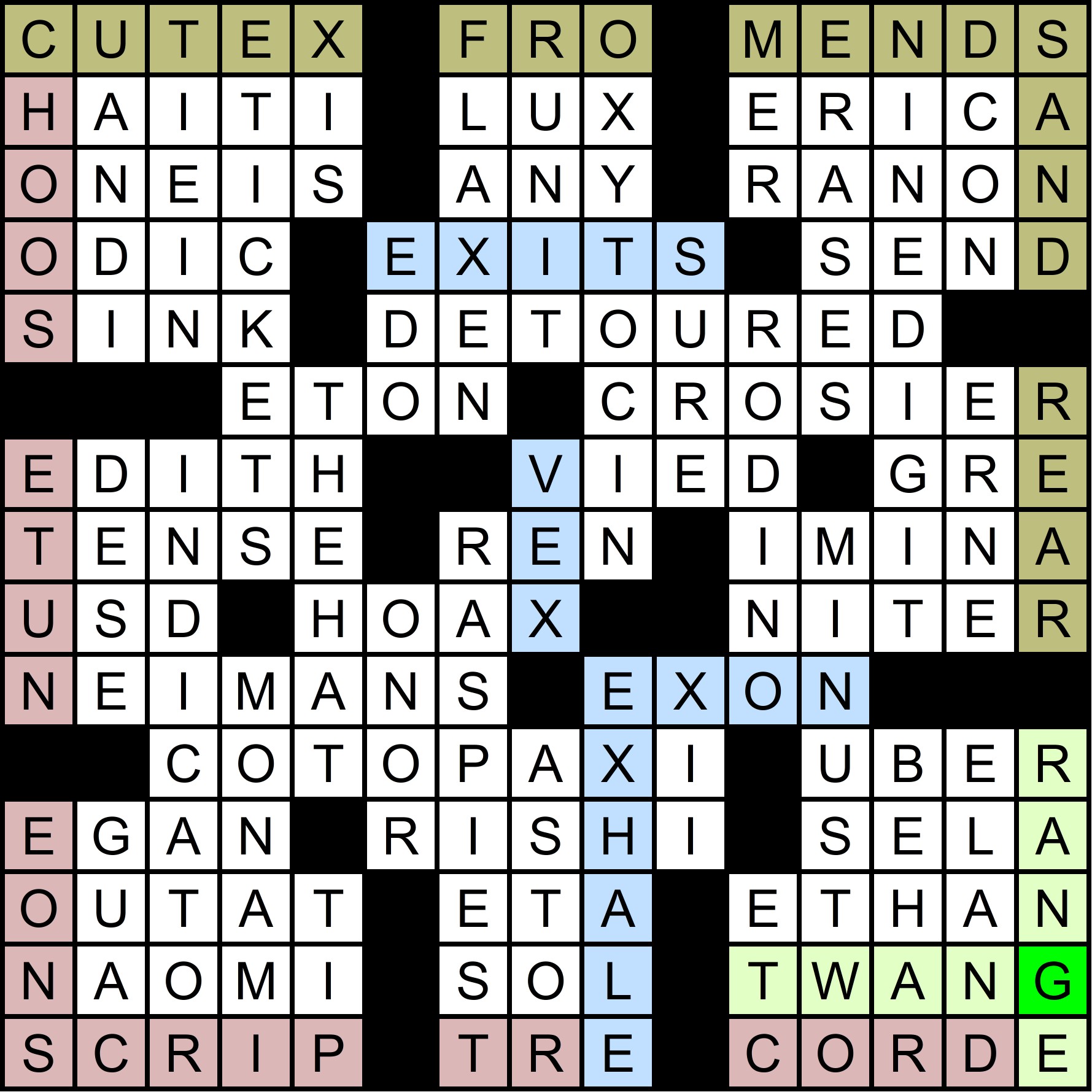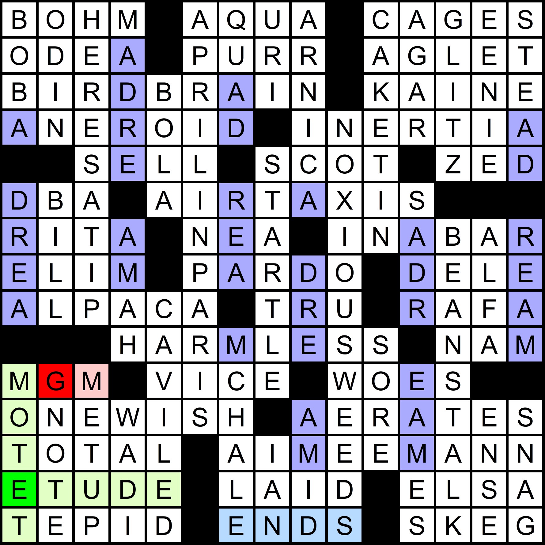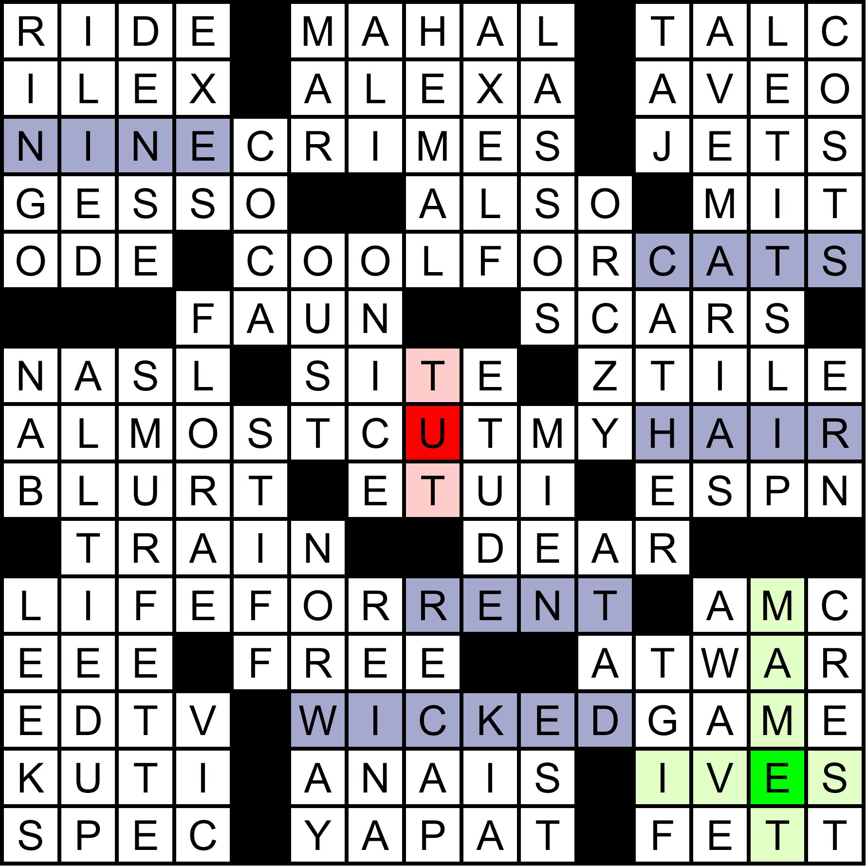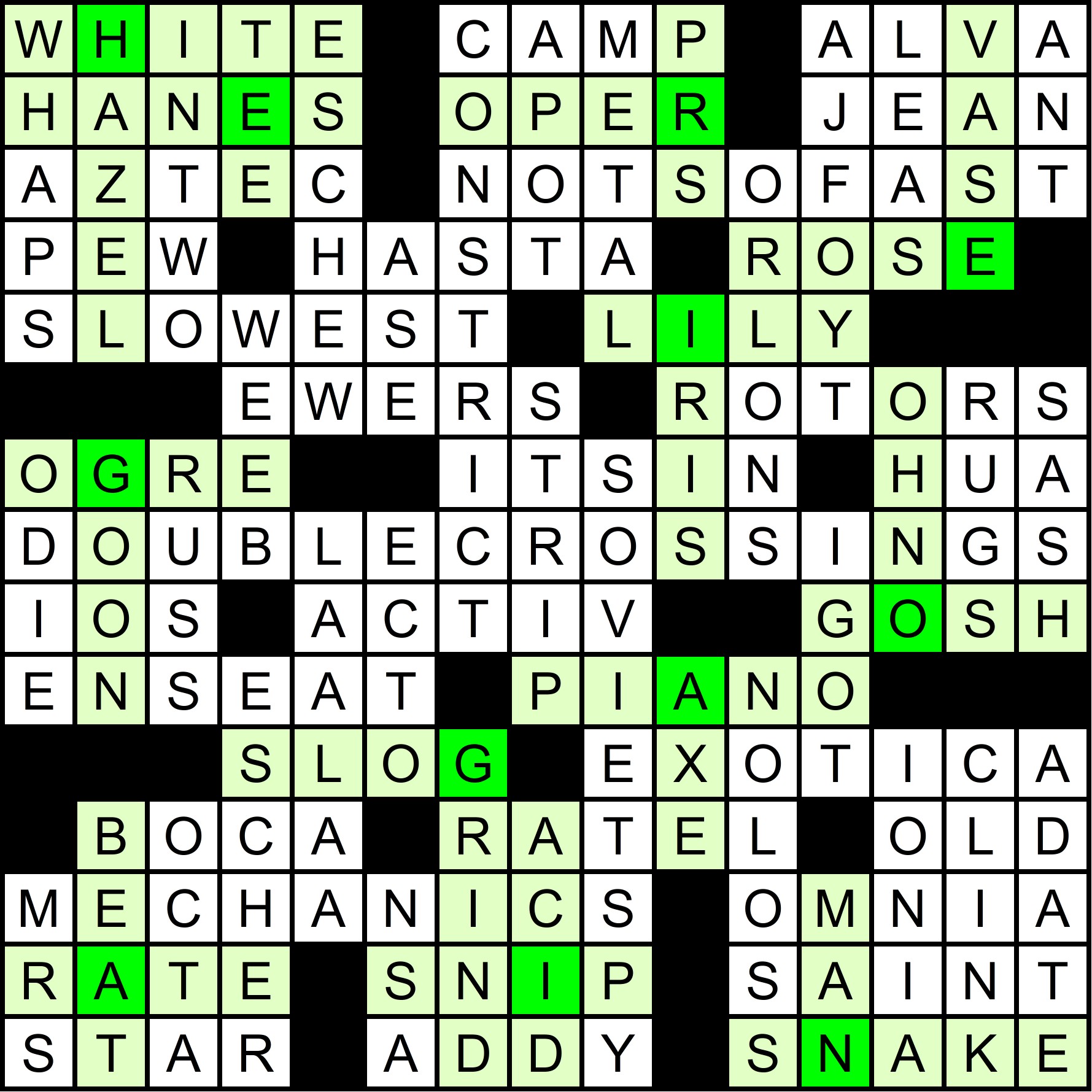 The 2018 mega-meta reveal contains 12 unclued Across entries. The middle entry, DOUBLE CROSSINGS, clued as [Betrayals, and, in a way, what you’ll find 12 times in this puzzle after filling in the missing clues], tells you what to look for. Each of the unclued entries has a corresponding Down entry with an appropriate clue. For example, ROSE intersects VASE [Still life subject] “ a clue that could also be used for ROSE. The list of intersecting words and their clues is shown below. Appropriately for a puzzle entitled œDéjà Vu, the 12 intersection letters spell out H-E-R-E-I-G-O-A-G-A-I-N. The first/last Across entries are WHITE/SNAKE, pointing to Whitesnake’s big hit, Here I Go Again, the 2018 mega-meta. Thanks (or hate mail) to Milo Beckman for the idea of not cluing 12 entries in this puzzle to make it harder!