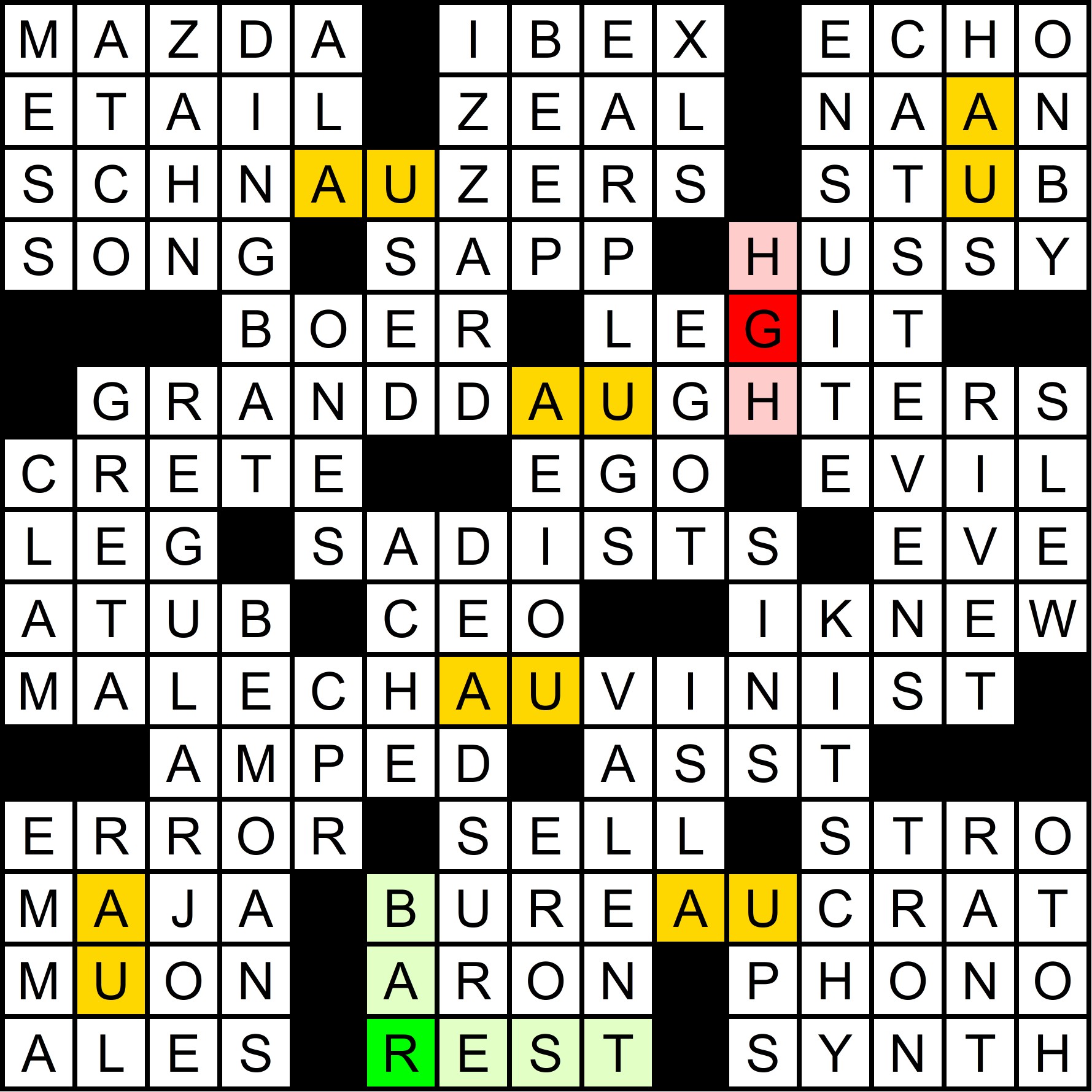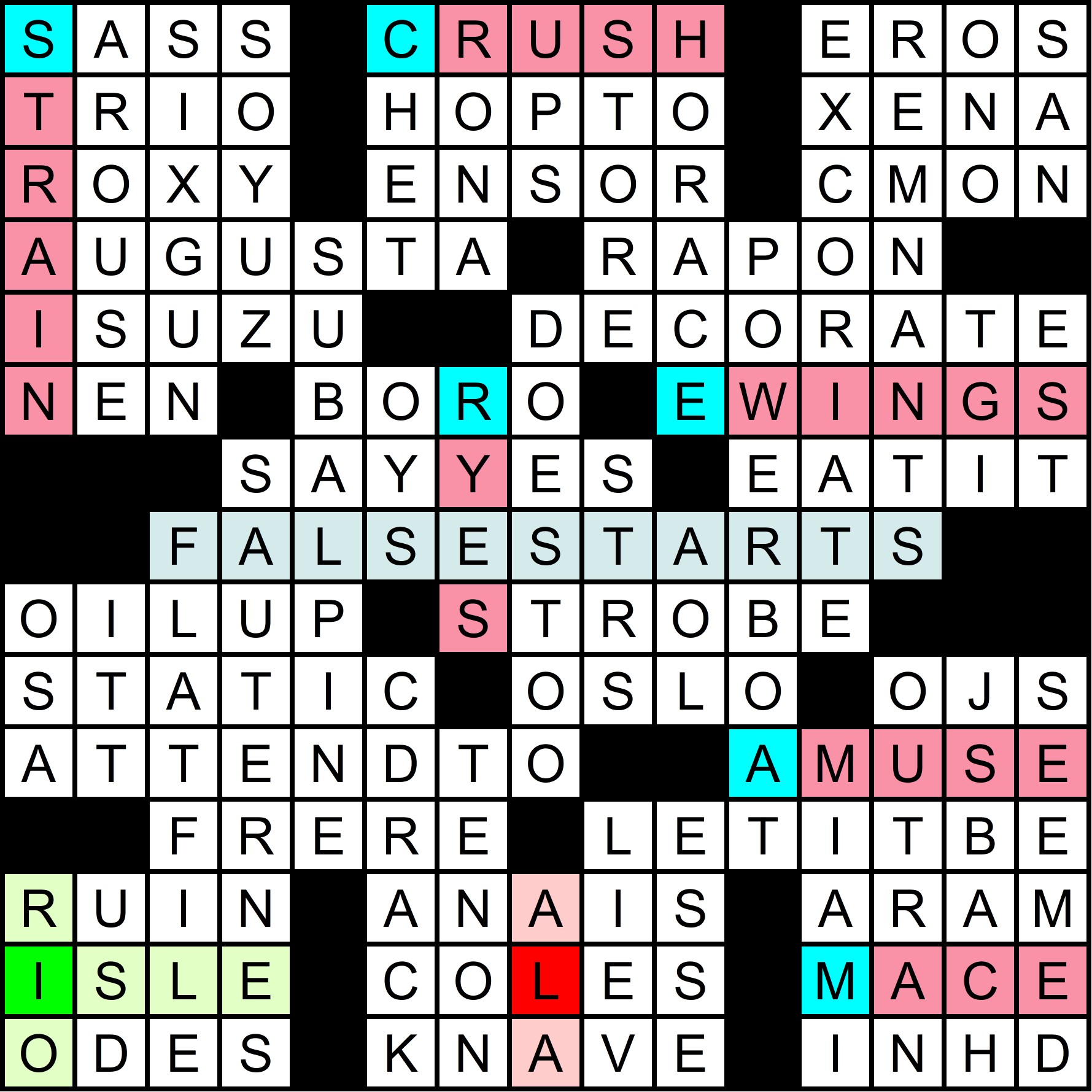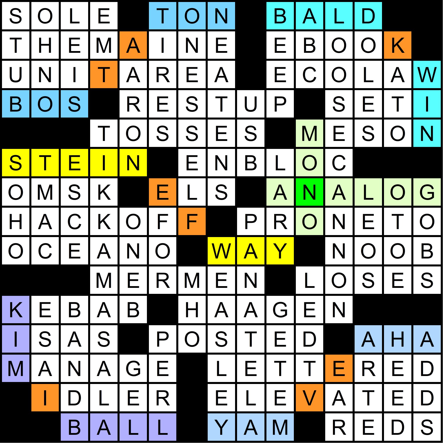 Each of this year’s MMMM puzzles contained exactly one pair of intersecting words that were clued identically. The intersections worked the same way as they did in this puzzle, spelling out Here I Go Again.