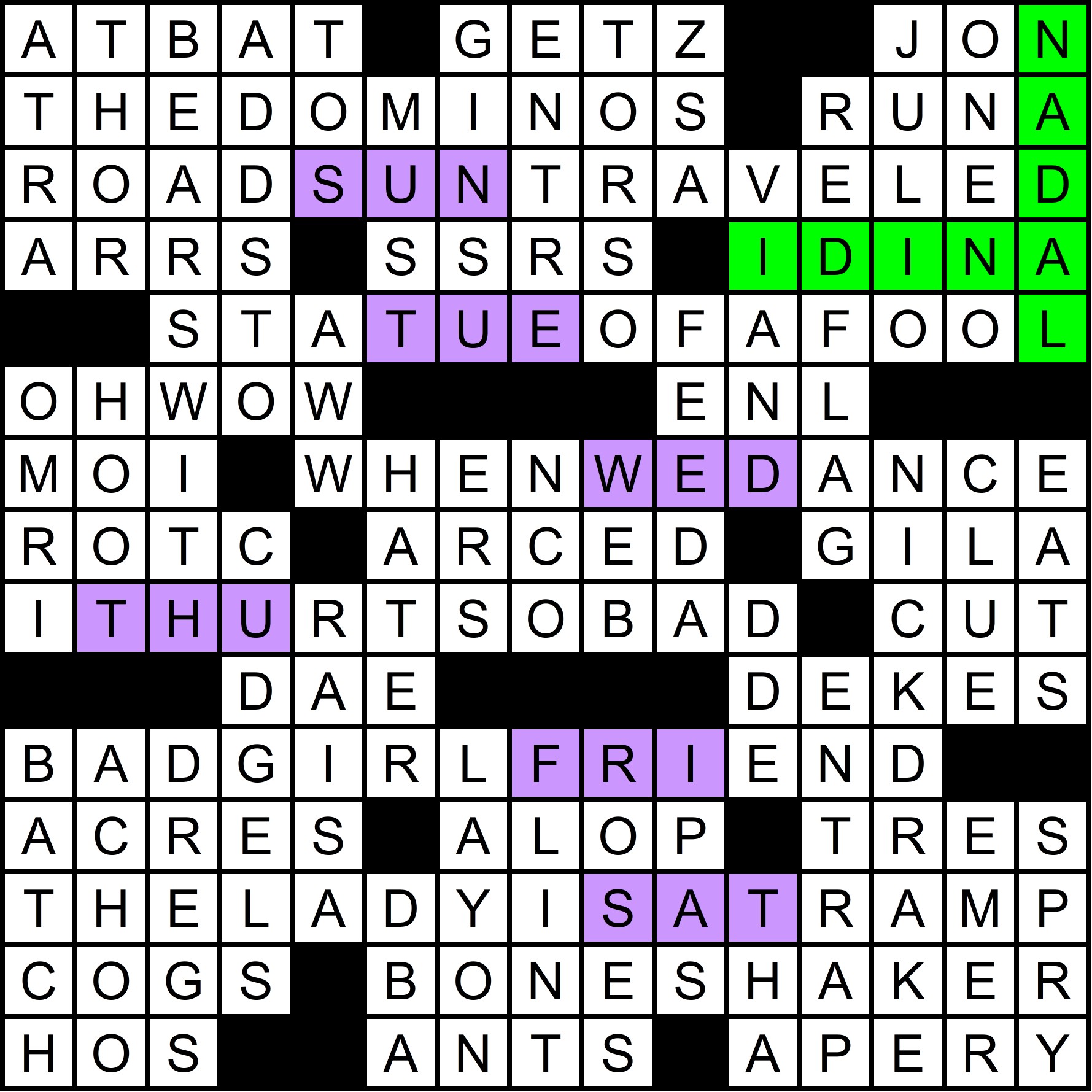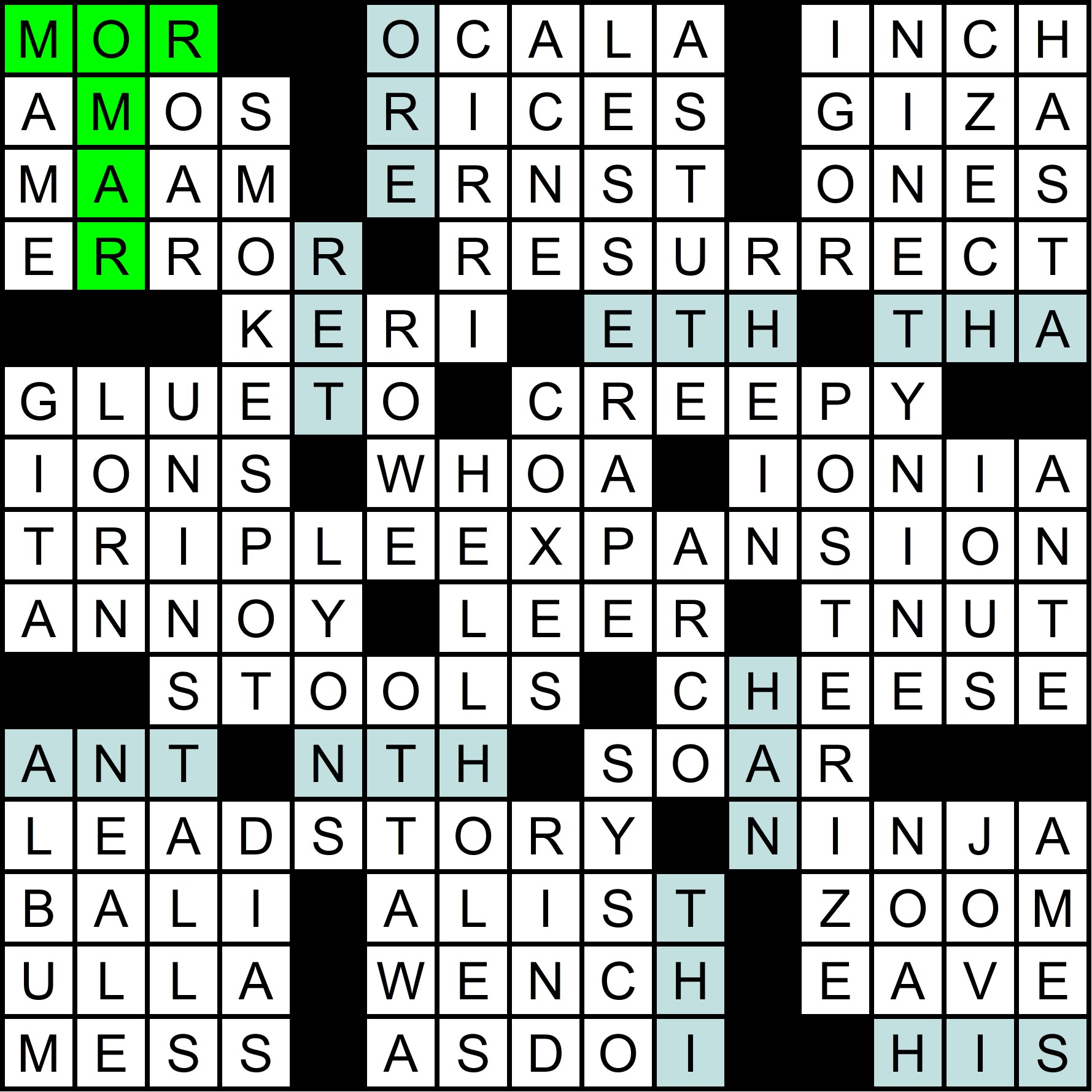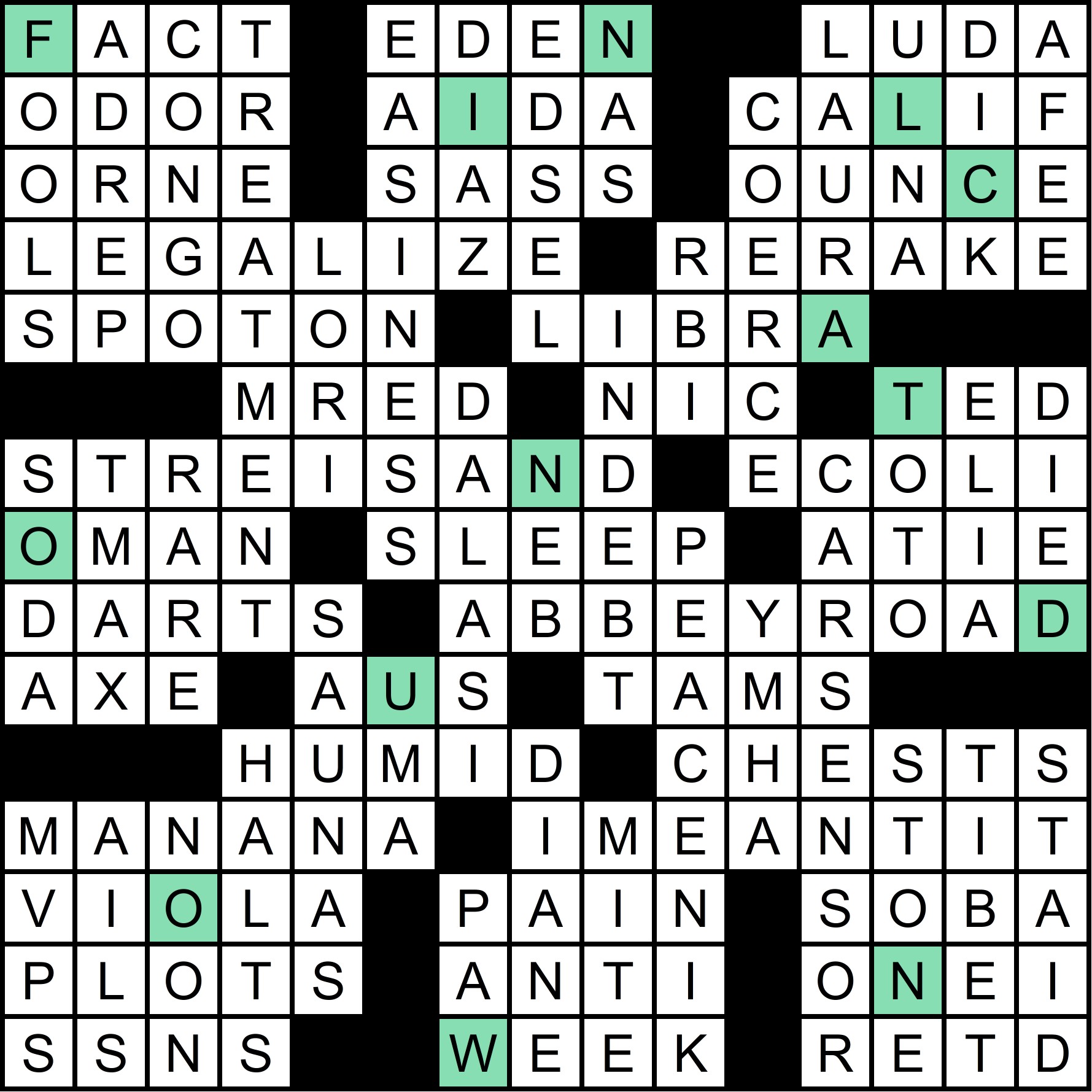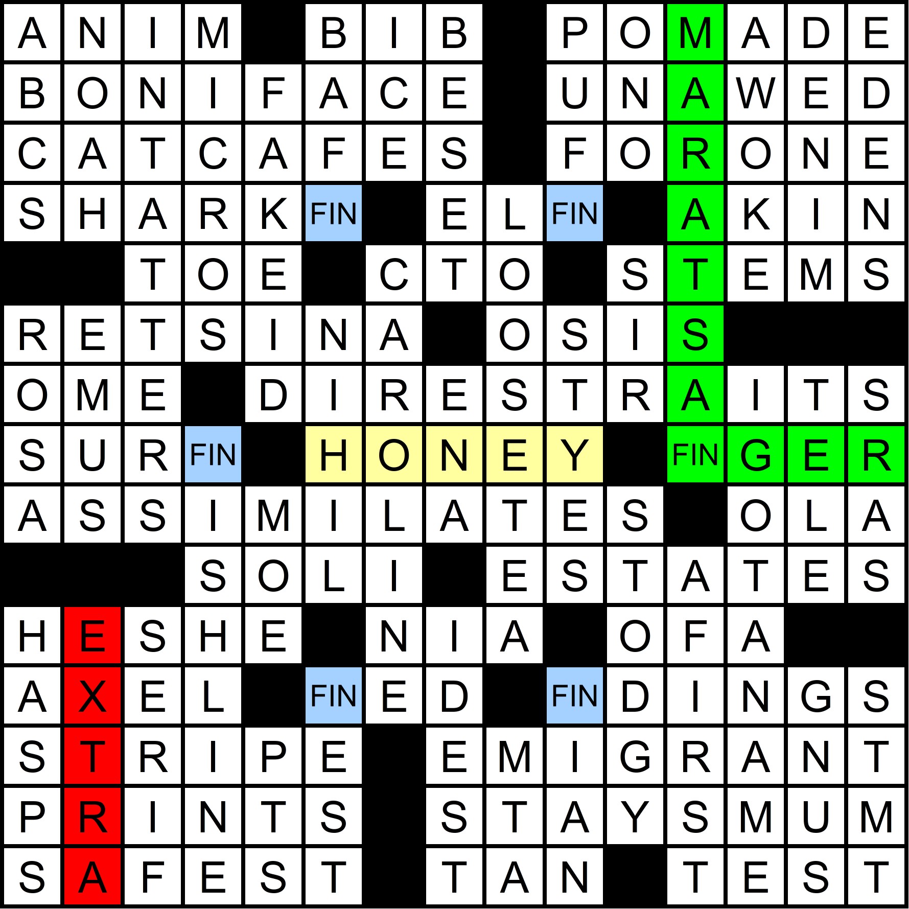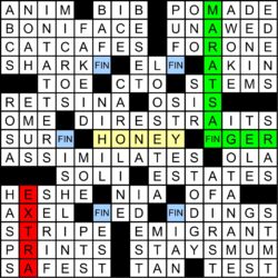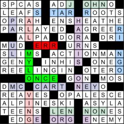 The mega-meta was slowly revealed throughout the year, as each of the 12 regular-season MMMM grids contained one clue pair, with the “FIN” rebus mechanism in the March MMMM making it possible to get 14 letters in 12 puzzles. The full list of clues is shown at the bottom of this write-up, along with thumbnails of each grid. A total of 70 solvers cracked the mega-meta before this puzzle came out. Congratulations to all of you!