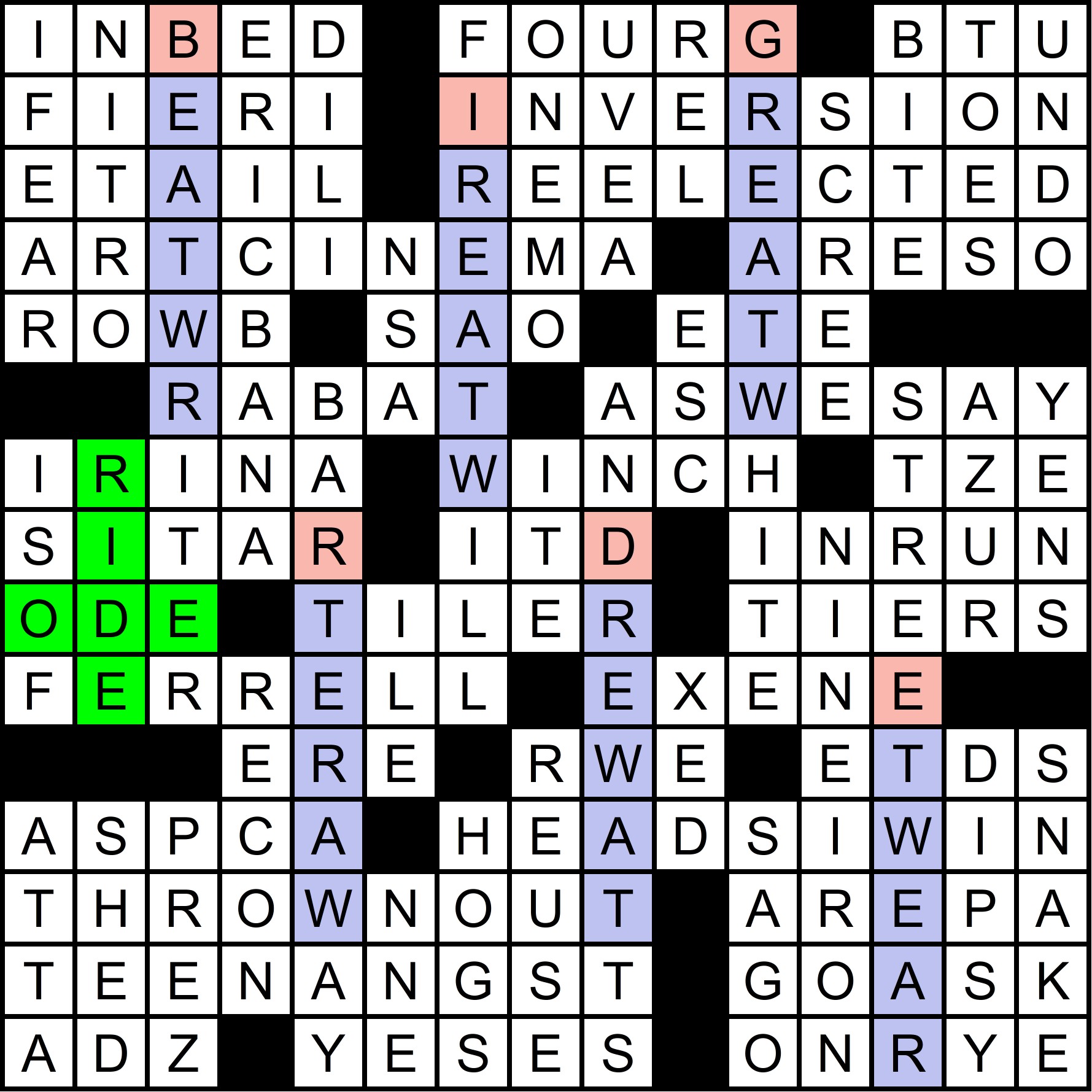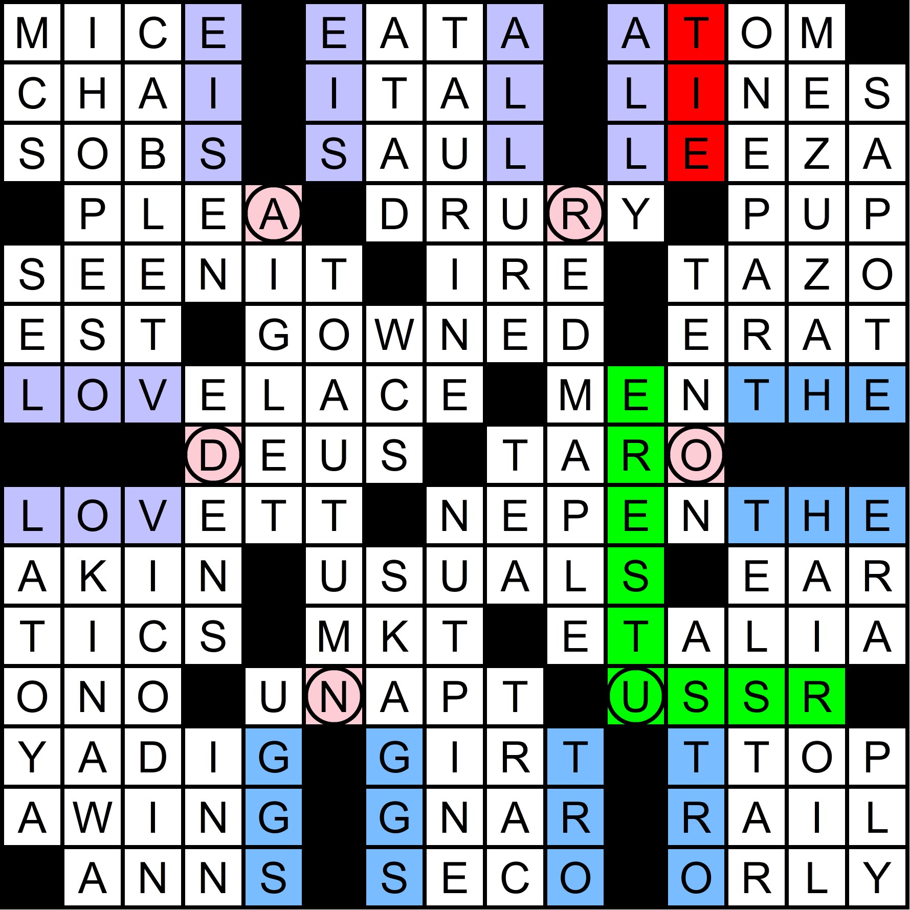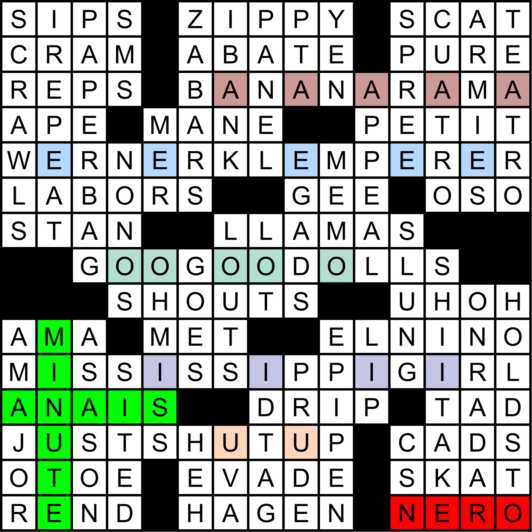 The mega-meta was slowly revealed throughout the year, as each of the 12 regular-season MMMM grids contained one clue pair, with the “FIN” rebus mechanism in the March MMMM making it possible to get 14 letters in 12 puzzles. The full list of clues is shown at the bottom of this write-up, along with thumbnails of each grid. A total of 70 solvers cracked the mega-meta before this puzzle came out. Congratulations to all of you!