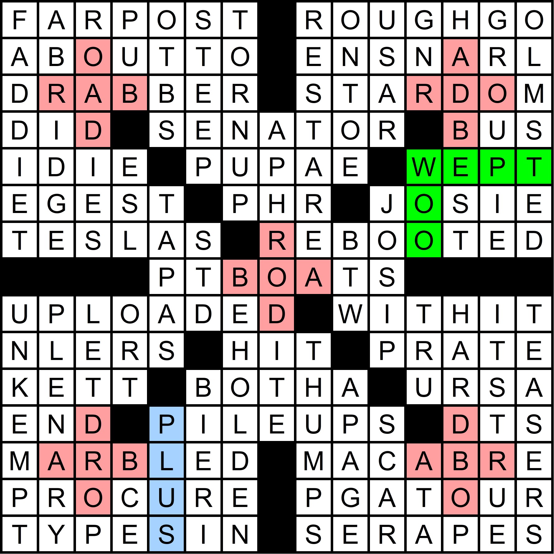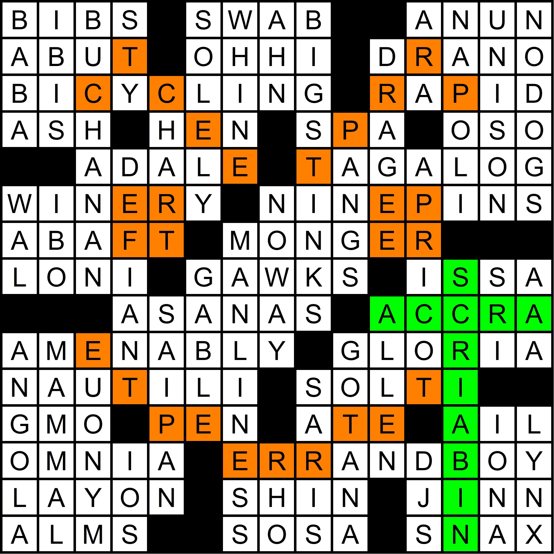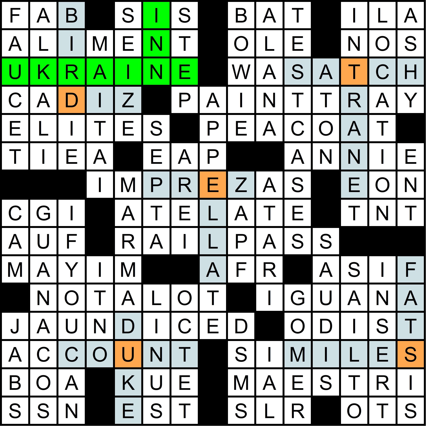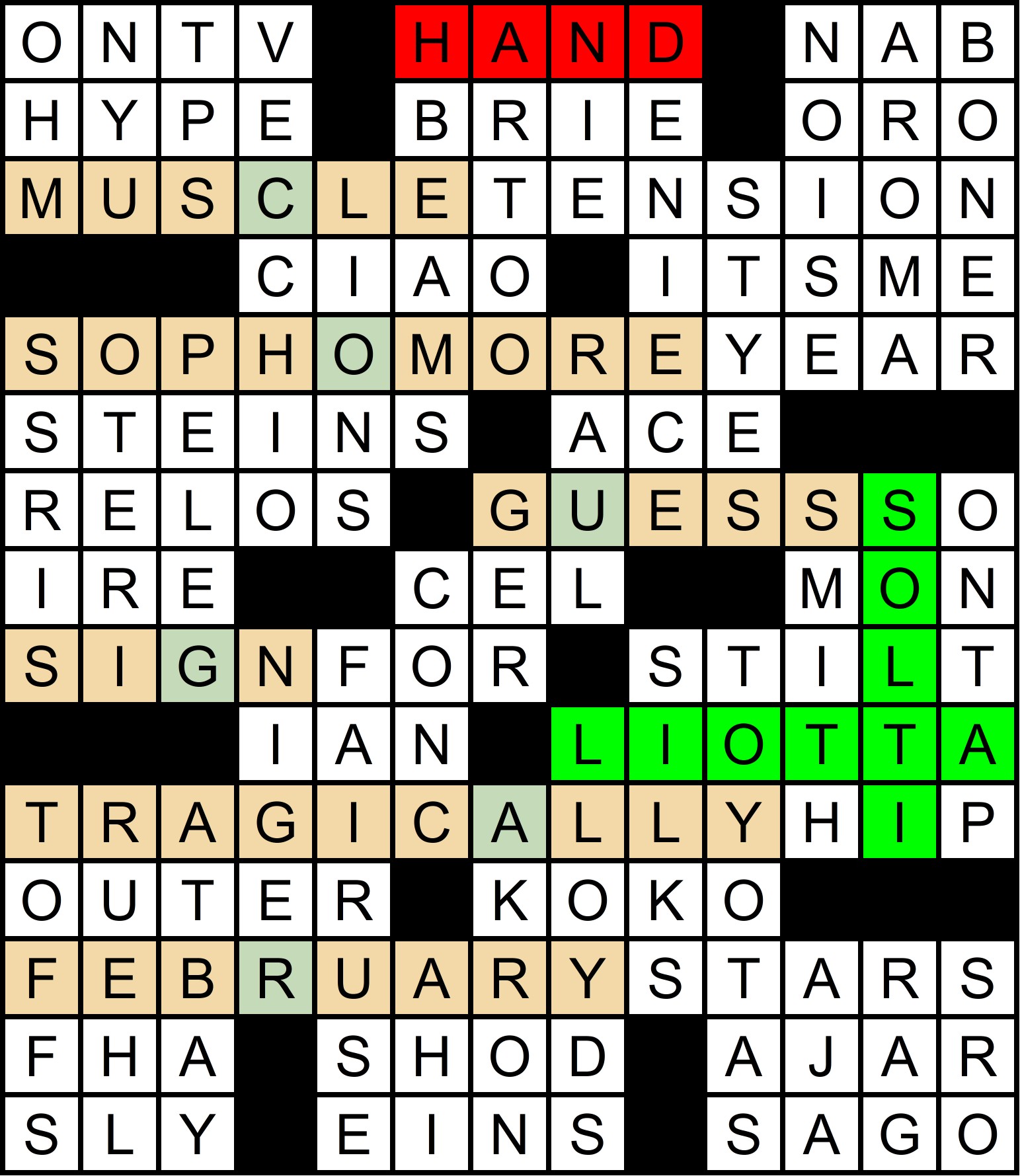 The mega-meta was slowly revealed throughout the year, as each of the 12 regular-season MMMM grids contained one clue pair, with the “FIN” rebus mechanism in the March MMMM making it possible to get 14 letters in 12 puzzles. The full list of clues is shown at the bottom of this write-up, along with thumbnails of each grid. A total of 70 solvers cracked the mega-meta before this puzzle came out. Congratulations to all of you!