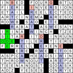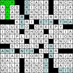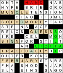 A total of 265 solvers got the mega-meta this year, including the 70 that solved it before this puzzle came out. We awarded extra bonus points this year to 51 solvers for getting the red herring. The average rating for the puzzle was 4.49 stars, and the average difficulty rating was 3.17. This month’s randomly chosen winner of an MMMM coffee mug is Joe Varone from Point Pleasant, NJ. Thanks to Matt Gaffney for blogging the puzzle at Crossword Fiend, where you can rate the puzzle (thanks!) and/or leave a comment.