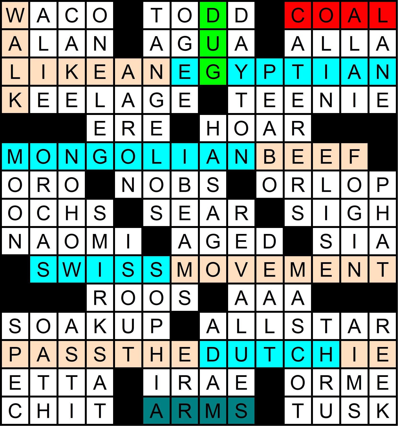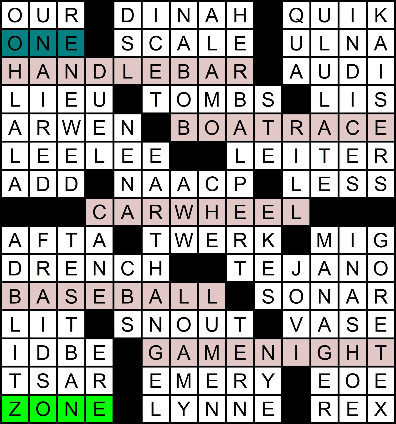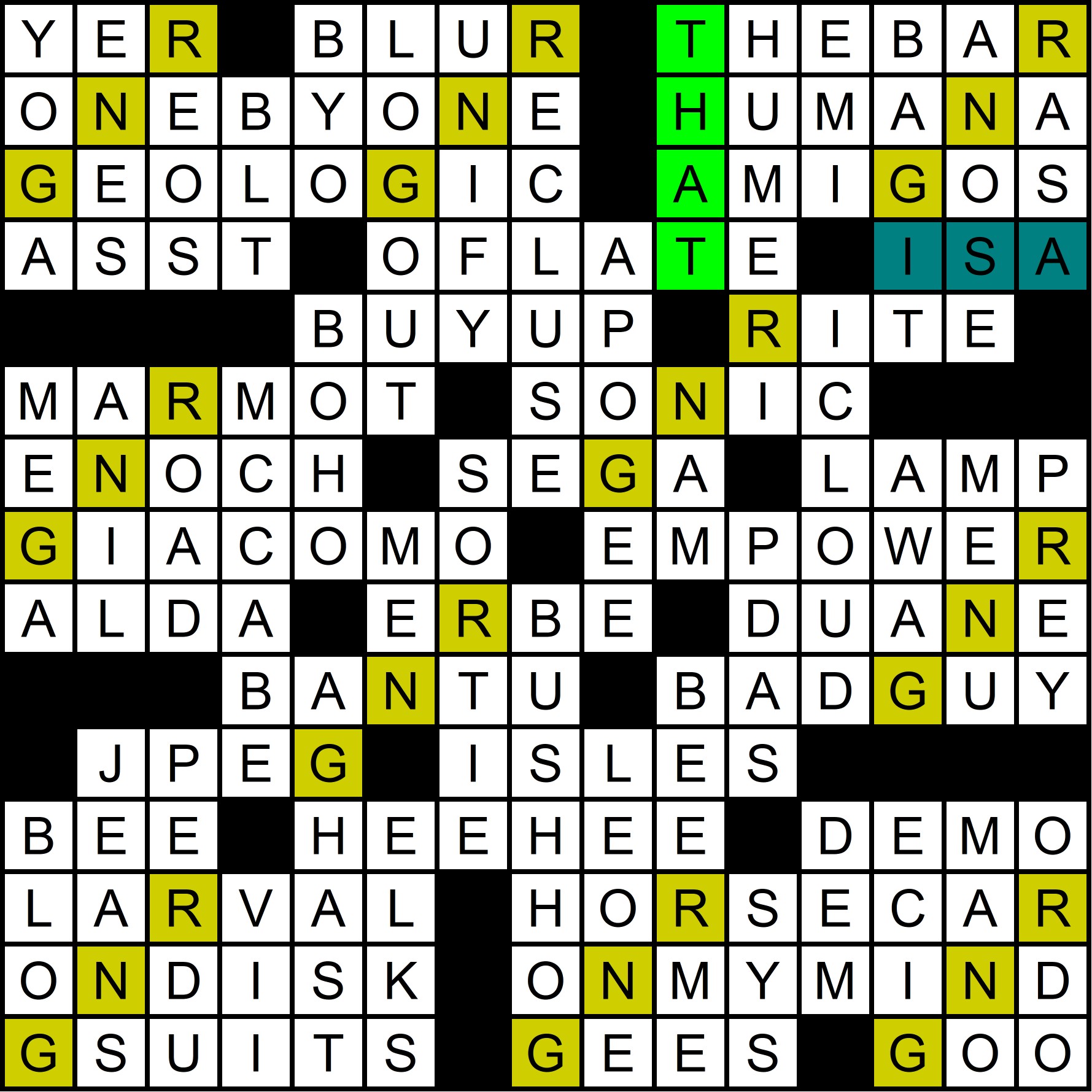 Each of the 12 monthly puzzles contained two relevant clues, one with œsong lyric from XXXX and the other with œlyric from a XXXX song. These clues would usually contain an artist name, but in these cases, they didn’t. For example, January™s puzzle contained EYE [“Slip inside the ___ of your mind” (song lyric from 1996)] and TREE [“A ___ can grow right through a rock” (lyric from a 1976 song)]. The two songs indicated are œDon™t Look Back in Anger by Oasis and œIf I Don™t Have You by Orleans. Oasis and Orleans both start with the same letter, and this is true for each artist pair in the 12 puzzles. Those letters in order spell out O-N-E-W-O-R-D-A-T-U-N-E or ONE WORD A TUNE.