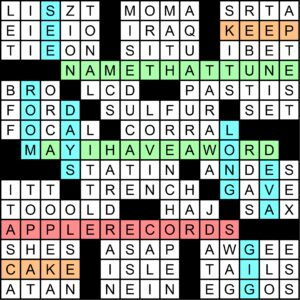 This puzzle also revealed this year™s red herring, a former record label, to be APPLE RECORDS [Lennon’s label, once (and the MMMM red herring)]. Apple Records has not issued any new material since 2009! The first puzzle of the year clued YOU as [“Addicted to ___” (song by an EDM artist who left us in 2018)]. Each of the next four puzzles had a clue worded similarly, as shown in the table below. The first letter of each of these artists spell out A-P-P-L-E, or the defunct label APPLE RECORDS.
