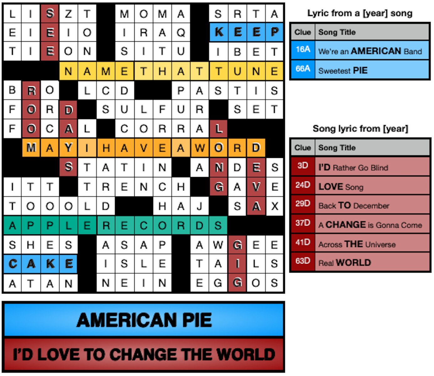 As shown in the table below, finding the appropriate song and choosing the right (highlighted) word gives two new song titles, namely this year™s mega-meta answers, American Pie and I™d Love to Change the World.
