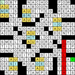As shown below, the first letters of these 12 “M M” entries spell out, in order, “DOUBLE M CLUES.” Wait a second? Is this self-referential? No! It’s a hint at the other, more subtle, “M” repetitions, where twelve Down clues contain words with consecutive M’s.