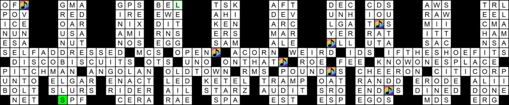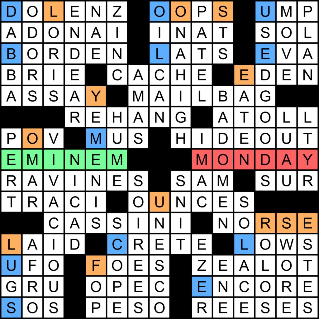 This puzzle also revealed this year’s red herring, a song from the ’60s that should be mentioned in the clues to the July puzzle, but isn’t. In the first puzzle of the year, FOUR was clued as [Number of times “Tuesday” occurs in the lyrics of the Moody Blues’ “Tuesday Afternoon”]. Each of the next five puzzles had a clue with the subsequent day of the week repeated twice, ultimately accounting for all days of the week except Monday, as shown in the table below: