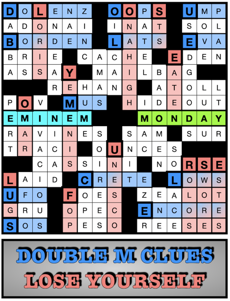 As is also shown below, the first letters of these 12 entries spell out this year’s mega-meta, Lose Yourself, Eminem’s smash hit from 2002. Note that EMINEM also appears in the grid, clued as [Rapper whose name sounds like a candy], as a subtle hint to the meta mechanism.