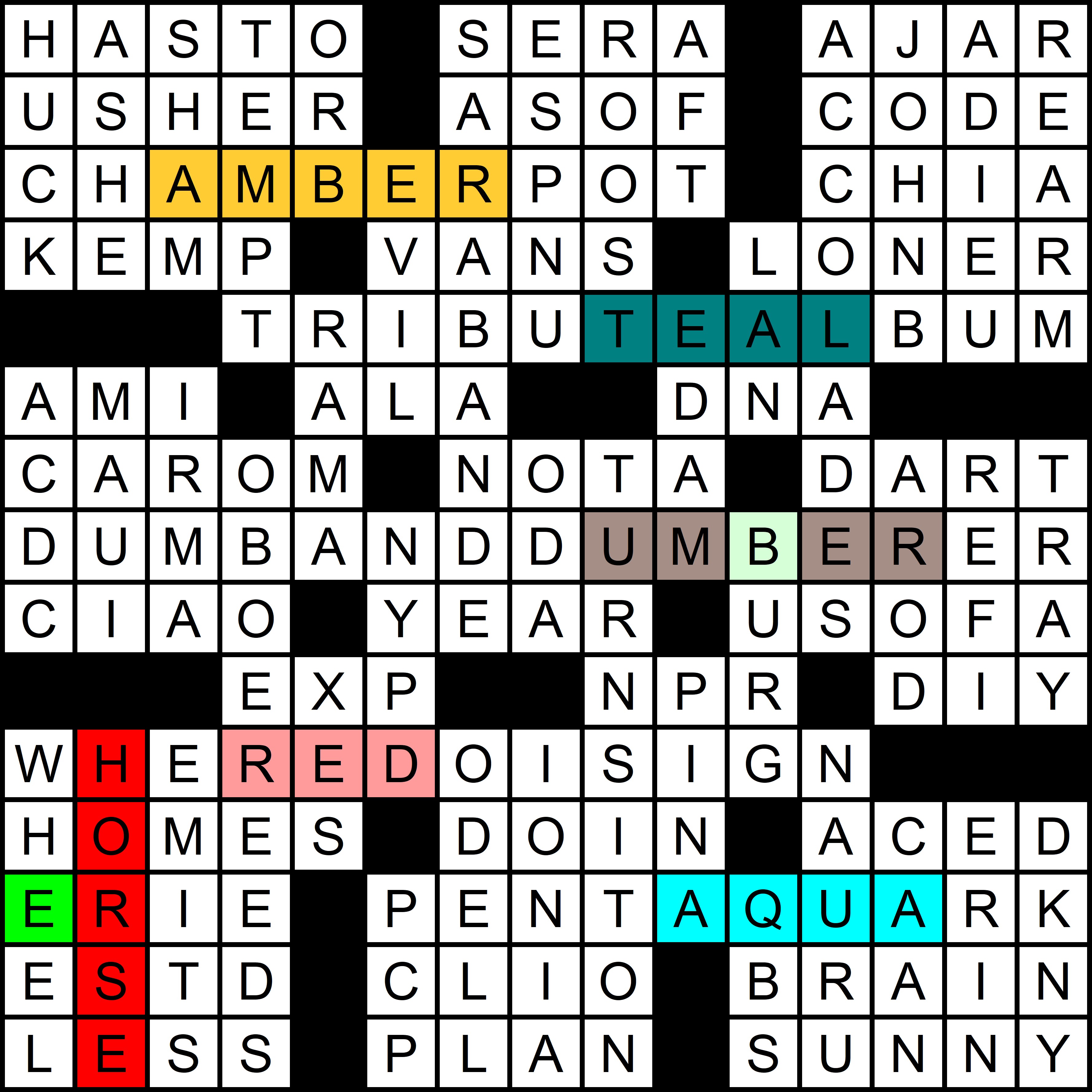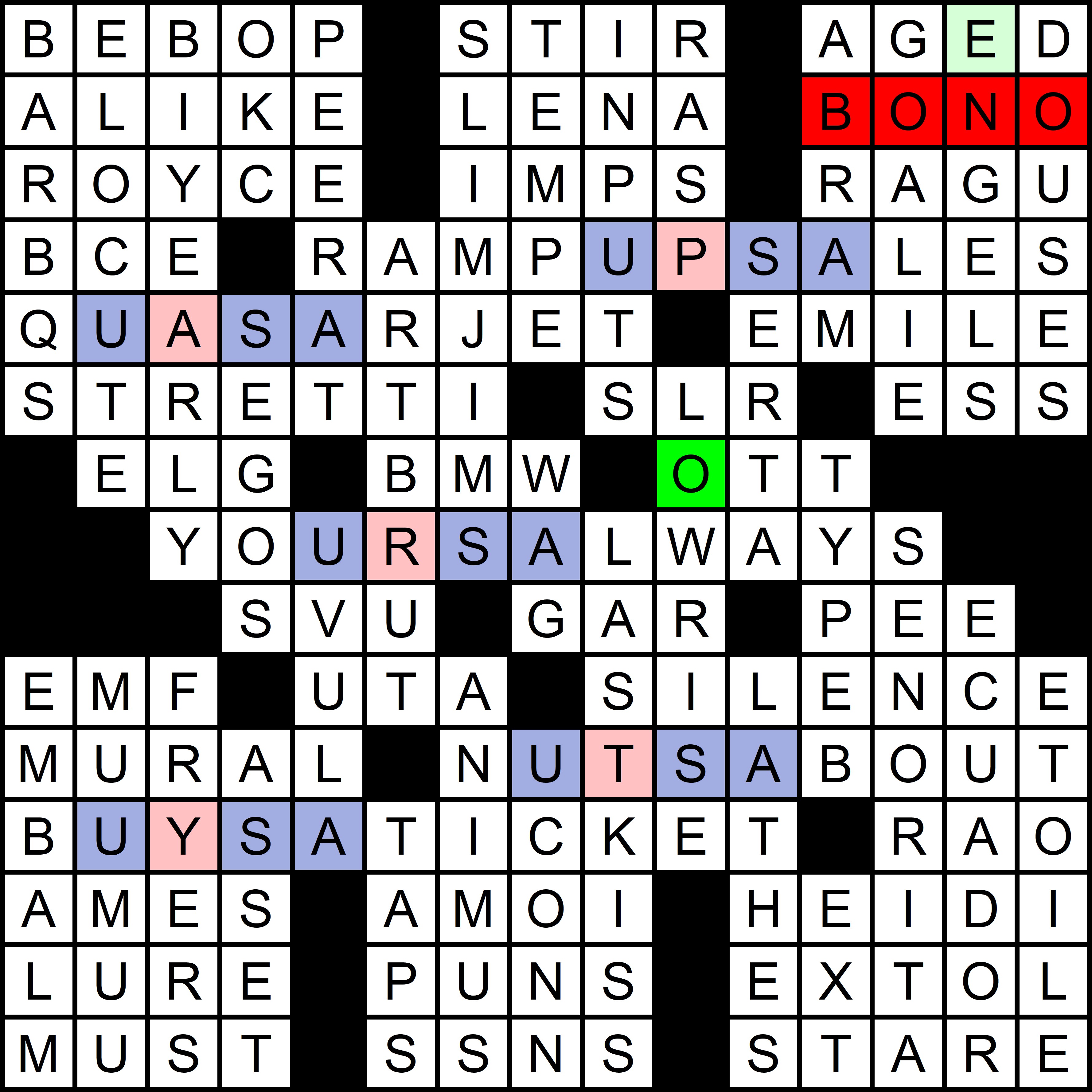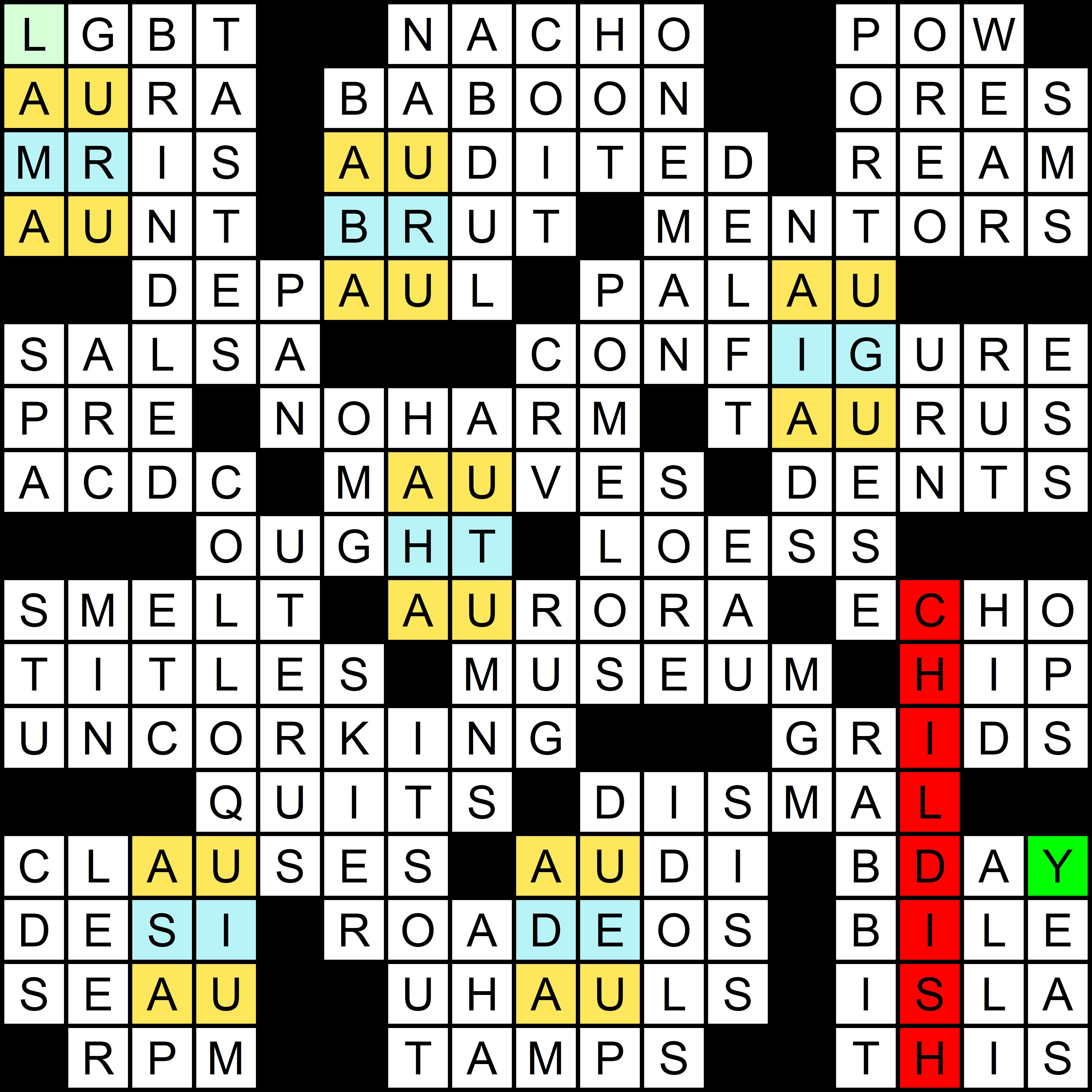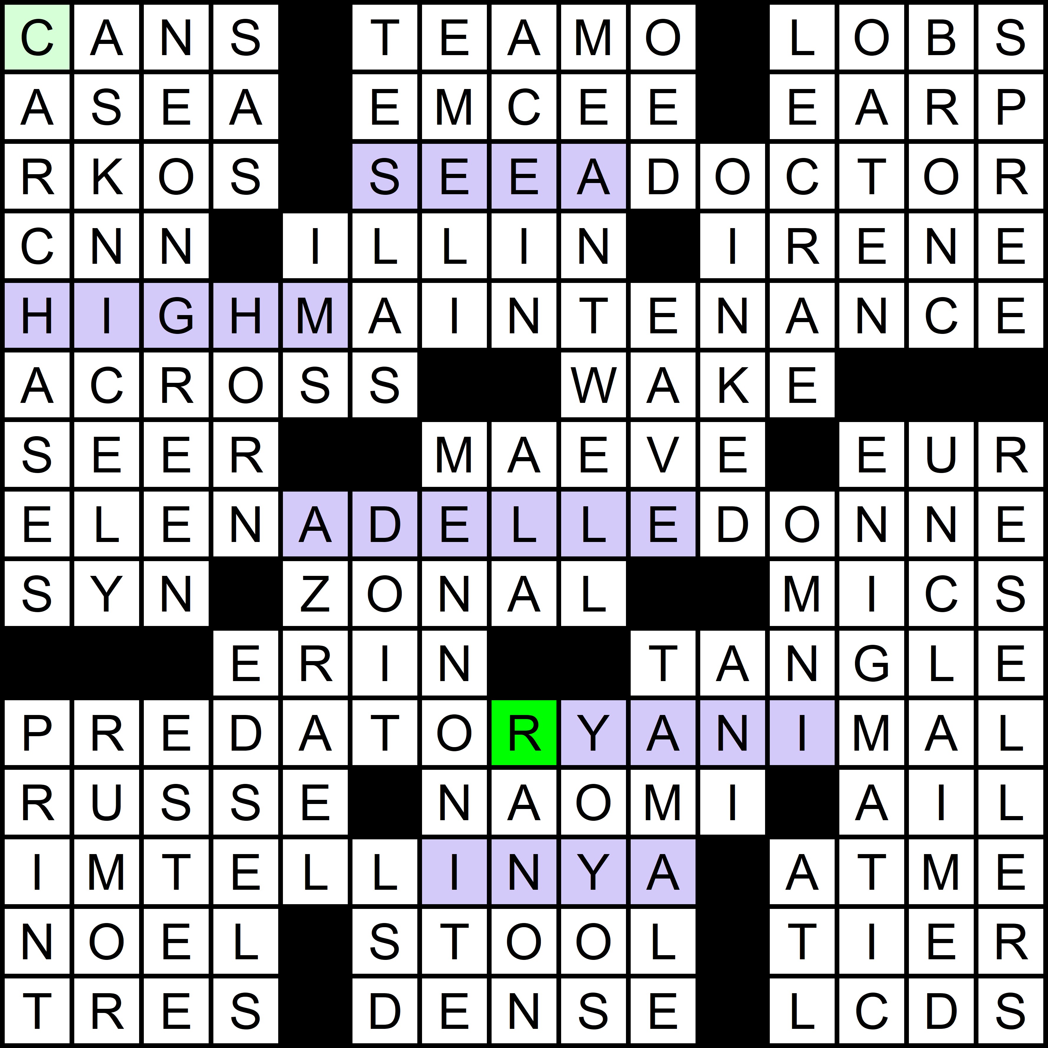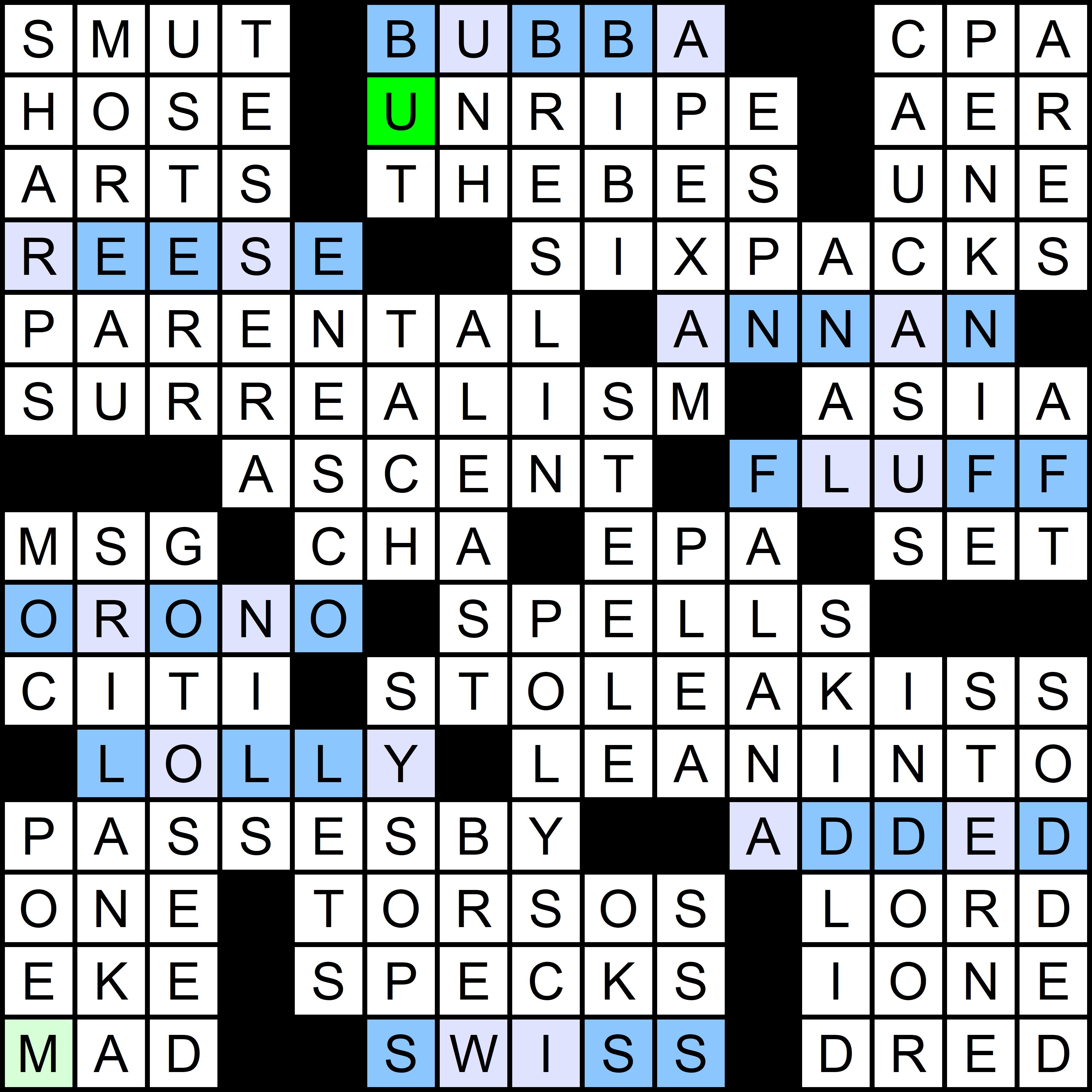 This puzzle also revealed this year’s red herring, a song from the ’60s that should be mentioned in the clues to the July puzzle, but isn’t. In the first puzzle of the year, FOUR was clued as [Number of times “Tuesday” occurs in the lyrics of the Moody Blues’ “Tuesday Afternoon”]. Each of the next five puzzles had a clue with the subsequent day of the week repeated twice, ultimately accounting for all days of the week except Monday, as shown in the table below:
