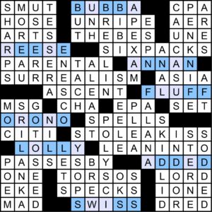 Evan suggests cluing PARENTAL as [___ Advisory: Explicit Lyrics (warning on some album covers)], SWISS as [Like the composers Arthur Honegger and Caroline Charrière], BUT as [“Missing” duo Everything ___ the Girl], and PLEA as [“Belated Forgiveness ___” (song by Donovan)].
