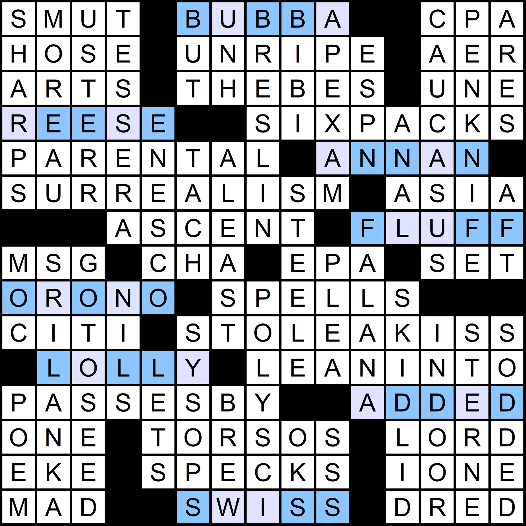This month’s MMMM challenged solvers to find an alternative rock trio. The key to cracking the meta is found in the puzzle’s title, “60% Solution,” which relates to the composition of certain grid entries. There are exactly eight five-letter entries, and each of them contains three of the same letter, as follows: