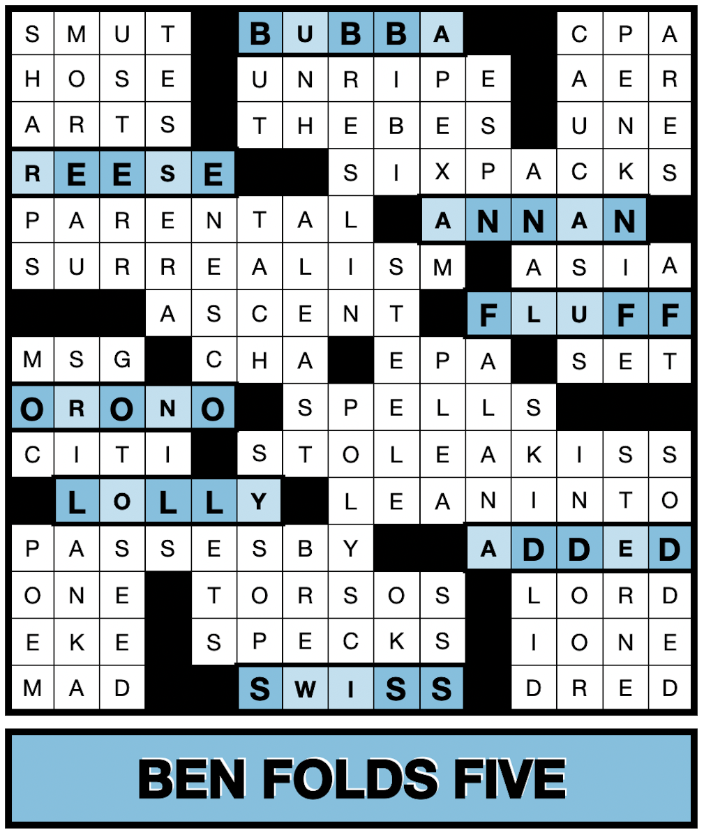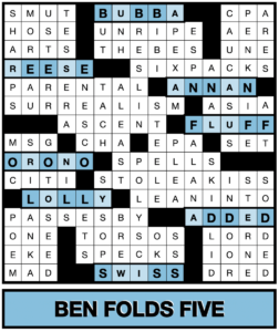 These triple letters comprise three out of five, or 60%, of each of the entries. In order, the letters spell out B-E-N-F-O-L-D-S. Bingo! Combining this with the fact that these are all five-letter words yields this month’s meta answer, Ben Folds Five, which is a trio, despite the band name. We also gave full credit for Ben Folds.