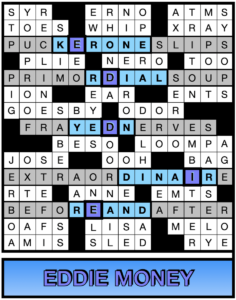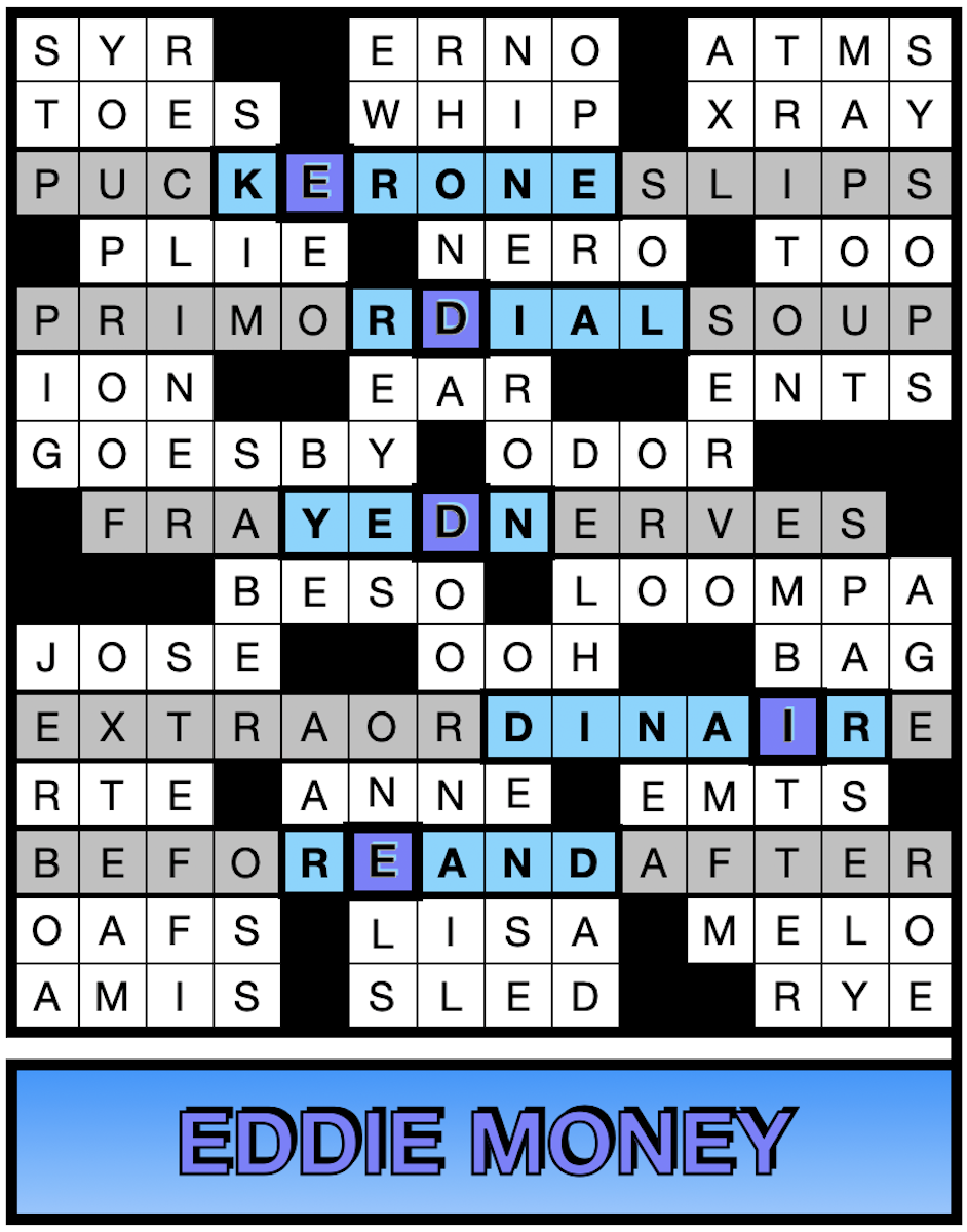 The letters within each currency – or money – spell out E-D-D-I-E, yielding this month’s meta answer, Eddie Money. A hint to both the meta mechanism and answer was provided by the term “cabbage” in the title, which is slang for “money.”