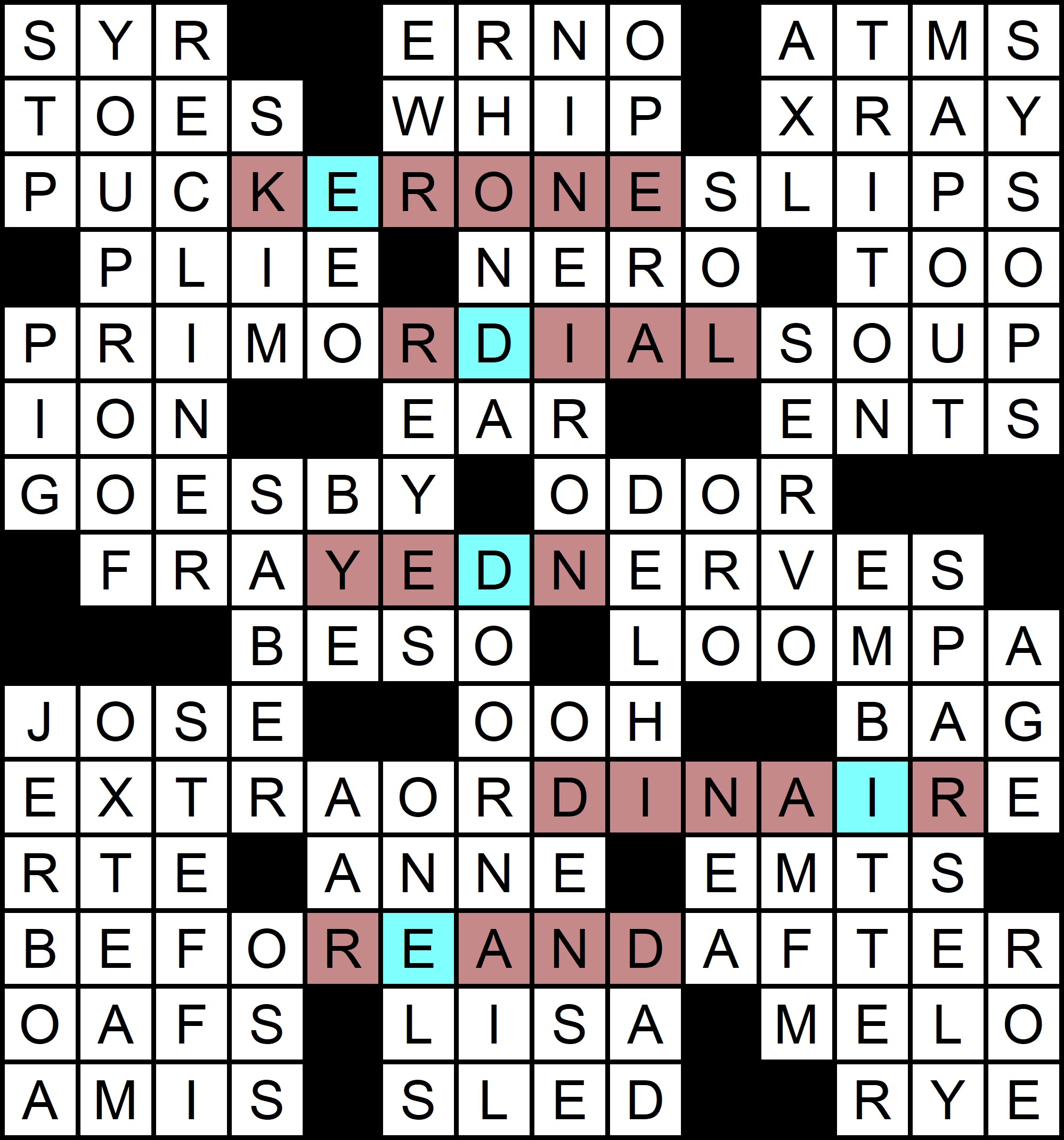 Evan suggests cluing LOOMPA as [“Oompa-___, doompadee-doo! / I’ve got another puzzle for you!” (lyric from “Willy Wonka & the Chocolate Factory”)], BAG as [Pipe opening?], and PIG as [“___ on Her Head” (children’s song by Laurie Berkner that mentions a certain farm animal appearing on her head)].