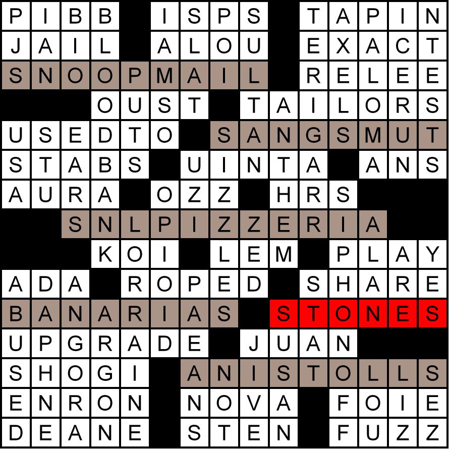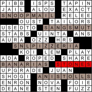 A total of 79 solvers got the meta for September, “Wild Horses” by the Rolling Stones. They noticed that the five theme entries anagrammed to different types of horses: PALOMINOS, MUSTANGS, LIPIZZANERS, ARABIANS, and STALLIONS. The title “In the Mix” provided a subtle hint towards anagramming. In a cryptic sense, all the horses in the puzzle are “wild.” The Rolling STONES were featured in the grid and their lead singer Mick Jagger was used in the clue for SNL PIZZERIAS. “Wild Horses” was on Rolling Stone’s list of the 500 greatest rock and roll songs of all time for a while, although it’s not on the current list.
