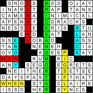 Some good suggestions for clues that could have been musical. Pancho Harrison, Norm H, and Jeff Louie all suggested cluing ANASTASIA as the woman mentioned in “Sympathy for the Devil.” Al Sanders suggested [“Look at me, I’m ___”] for SANDRA DEE. Pete Mitchell as well as Eric LaVasseur mentioned the B52’s “Planet CLAIRE.” And Michael Marcus threw out Cobra Starship’s “Good Girls GO BAD”