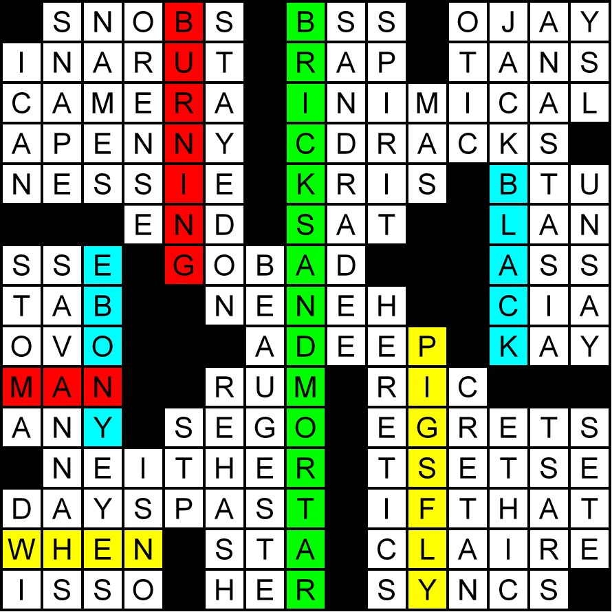 Matt Gaffney who blogs the puzzle every month addressed the controversy by saying the puzzle treads a fine line between lovely mosaic and jumbled mess, ultimately choosing the mosaic (thanks Matt). His write-up is here. A big I’M SORRY from me for creating a meta with this much ambiguity. I will strive not to do so in the future.